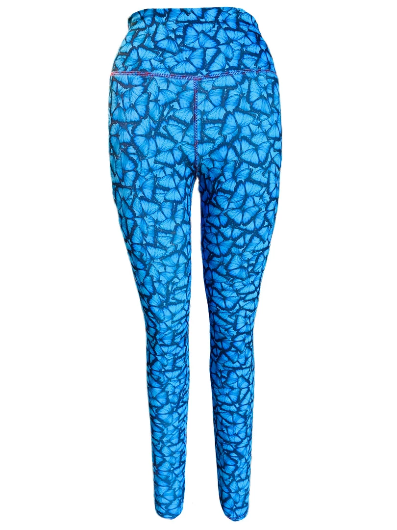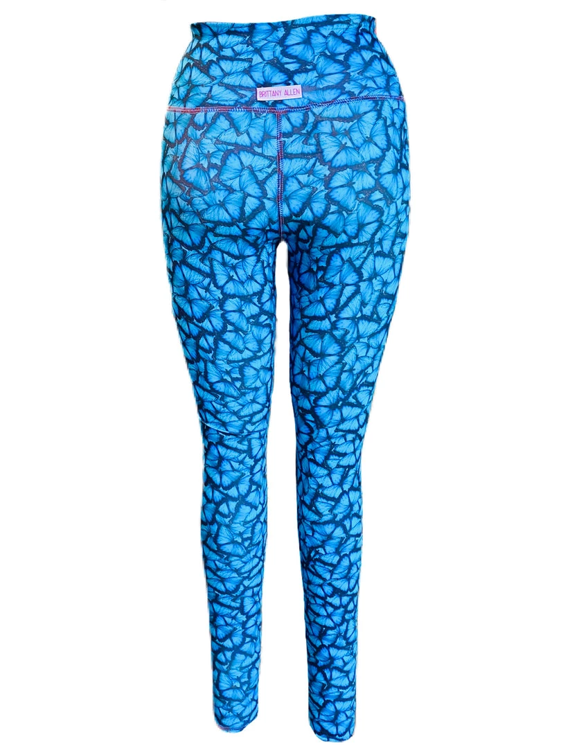 The Blue Butterfly Legging is made with our brand’s exclusive blue butterfly printed spandex, looped coverstitching on the waistband and crotch seams, and features a built in waistband.