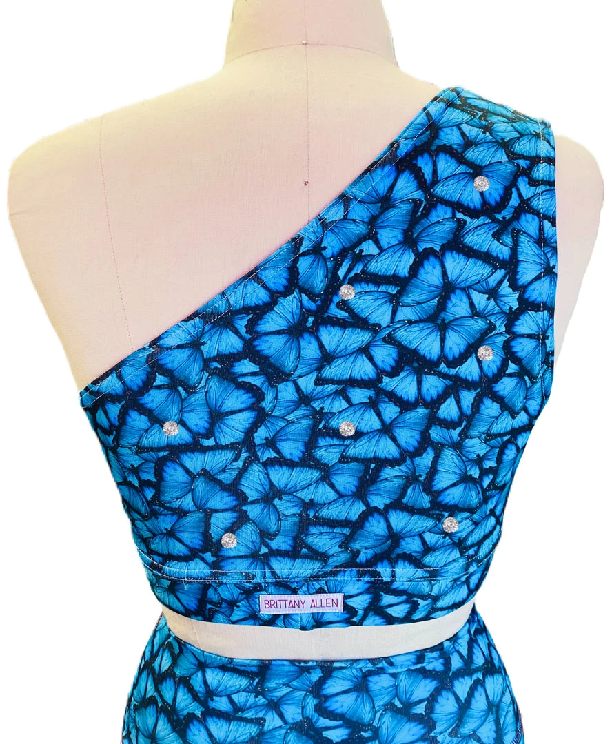 This blue butterfly shoulder sports bra is made with our brand’s exclusive blue butterfly printed spandex with a lining, single shoulder silhouette, built in covered elastic band, and scattered rhinestones on front and back for a little sparkle.