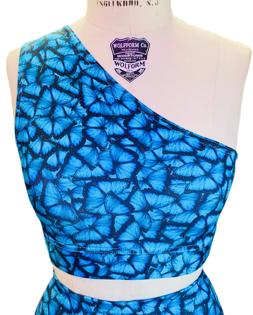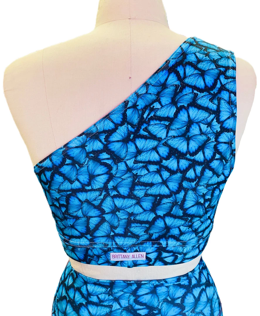 This blue butterfly shoulder sports bra is made with our brand’s exclusive blue butterfly printed spandex with a lining, single shoulder silhouette, and built in covered elastic band.
