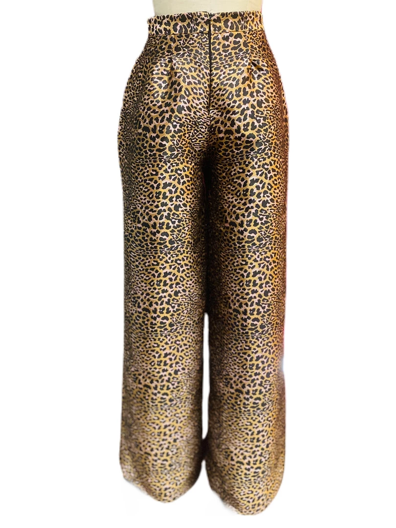 The “Leopard Brocade Straight Leg Pant” is a true straight leg that hangs from the waist to perfection. The fabric is a medium weight brocade woven. The pant has a waistband and an invisible zipper closure on the center back waist.