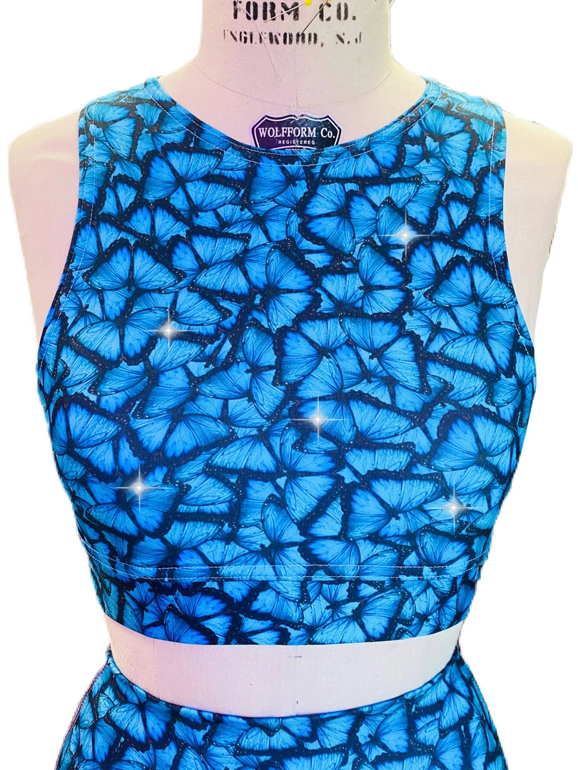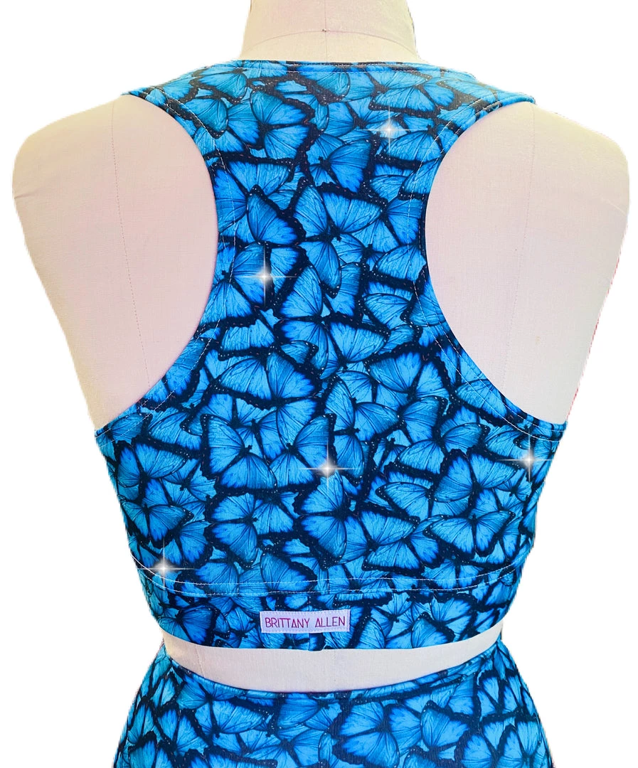 This blue butterfly bra is made with our brand’s exclusive blue butterfly printed spandex with a lining, built in covered elastic band, and topped with scattered rhinestones for a little sparkle in your life.Â
