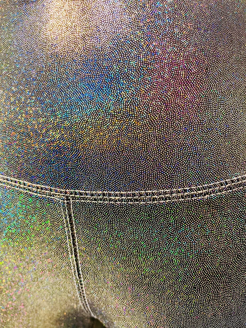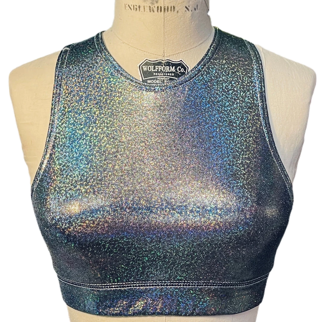 The Galactic Crew Neck Sports Bra is made with a rainbow mystique metallic spandex. The bra has a racerback style back, encased elastic waistband, fully lined interior, and coverstitching on the band seam to ensure no elastic twists and turns.