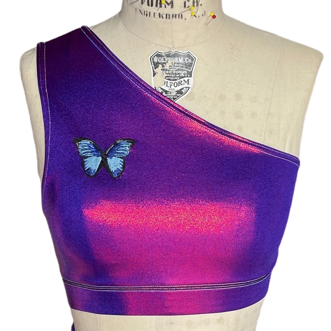 The Lola Shoulder Sports Bra is made with a rainbow-esque mystique fuchsia metallic spandex and features an adorable blue butterfly logo motif unique to our brand in the “heart” area of the chest. The bra has a one shoulder silhouette, encased elastic waistband, fully lined interior, and coverstitching on the band seam to ensure no elastic twists and turns.