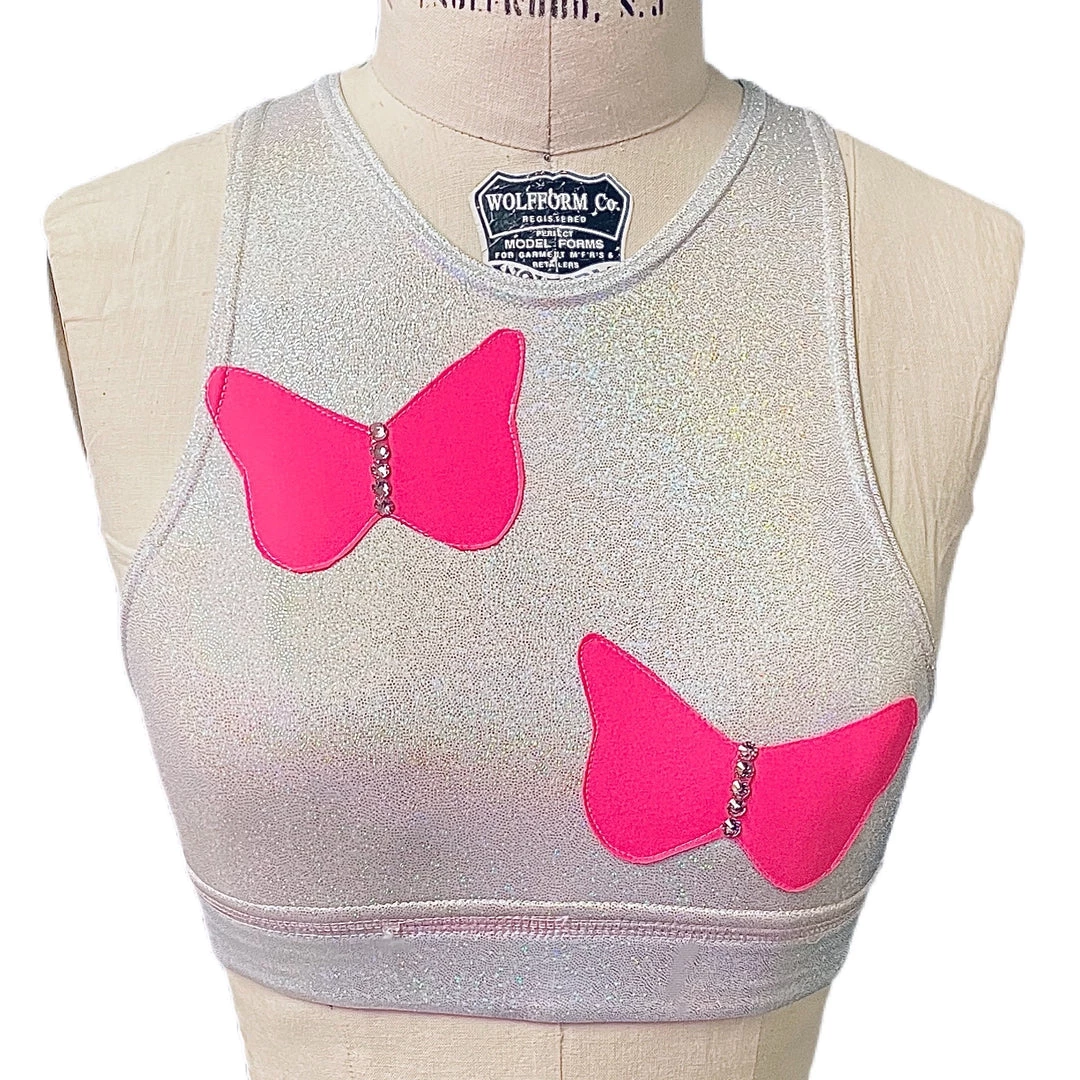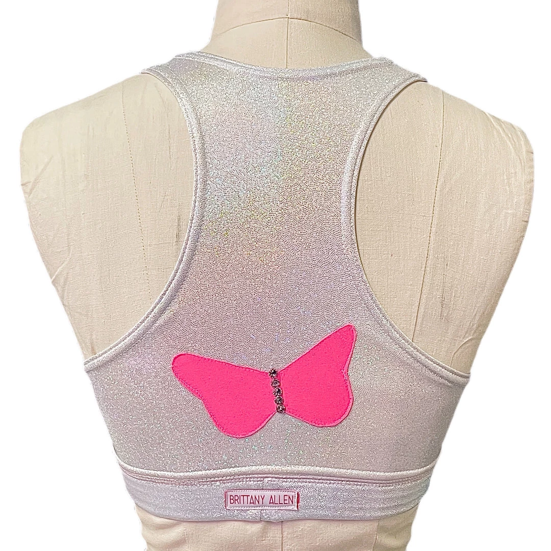 The Mariposa Crew Neck Sports Bra is made with a diamond mystique metallic spandex with spandex butterfly appliqués and finished with some rhinestones down the middle of the butterflies for a little extra sparkle. The bra has a racerback style back, encased elastic waistband, fully lined interior, and coverstitching on the band seam to ensure no elastic twists and turns.