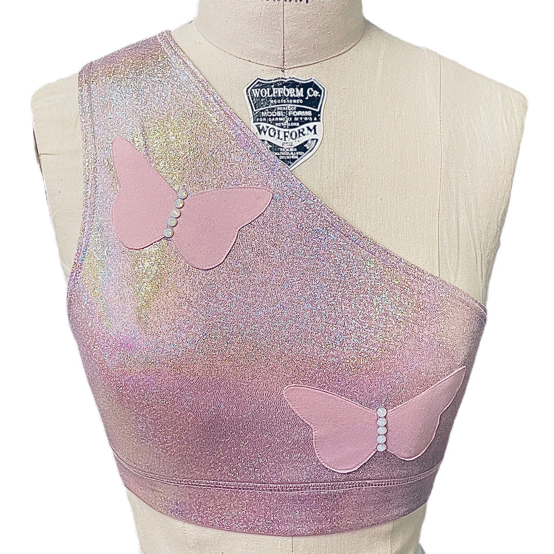 The Mariposa Pastel Shoulder Sports Bra is made with a pink pearl diamond mystique metallic spandex with spandex butterfly appliqués and finished with some rhinestones down the middle of the butterflies for a little extra sparkle. The bra has a one shoulder silhouette, encased elastic waistband, fully lined interior, and coverstitching on the band seam to ensure no elastic twists and turns.