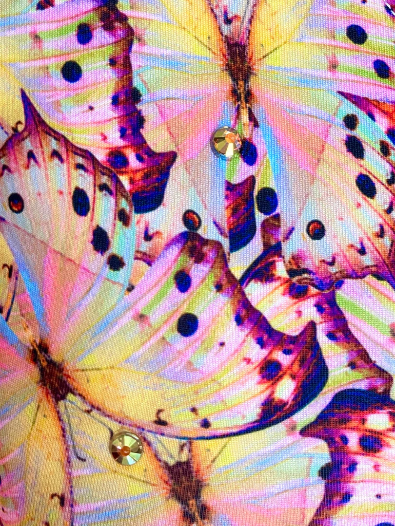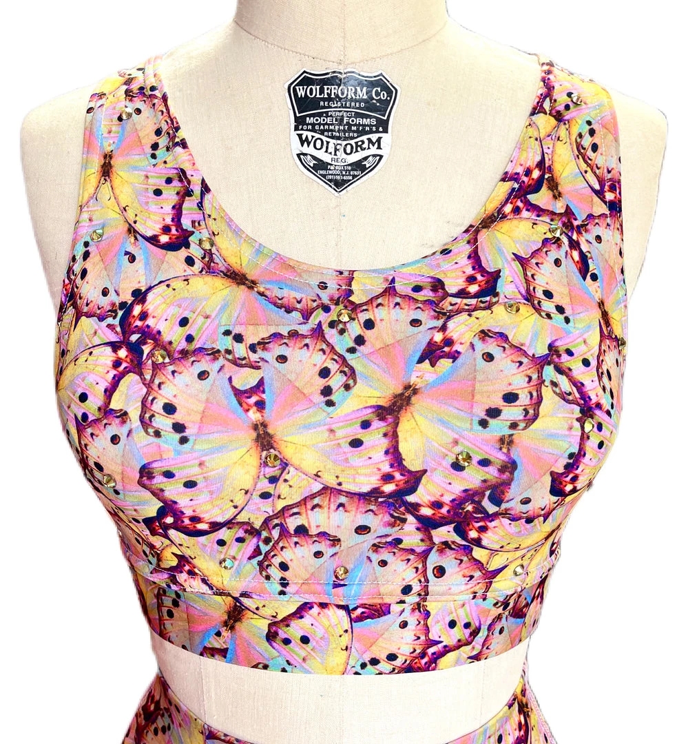 We stan a sustainable boss babe! The pink butterfly scoop neck sports bra is made with our brand’s exclusive pink butterfly printed spandex, which is composed of 84% recycled water bottles, and 16% spandex. It is fully lined and features a built in covered elastic band, and scattered “ghost light” rhinestones on front and back for a little sparkle.