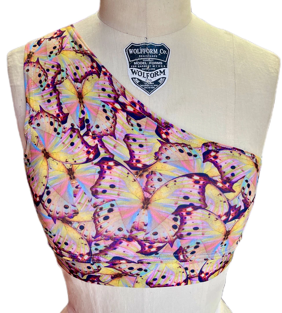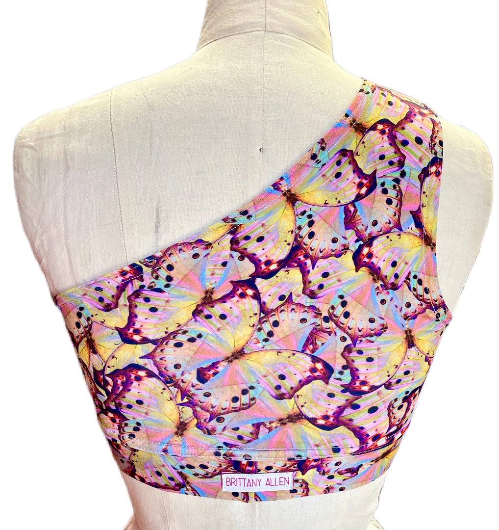 We stan a sustainable boss babe! The pink shoulder sports bra is made with our brand’s exclusive pink butterfly printed spandex, which is composed of 84% recycled water bottles, and 16% spandex. It is fully lined and features a built in covered elastic band.