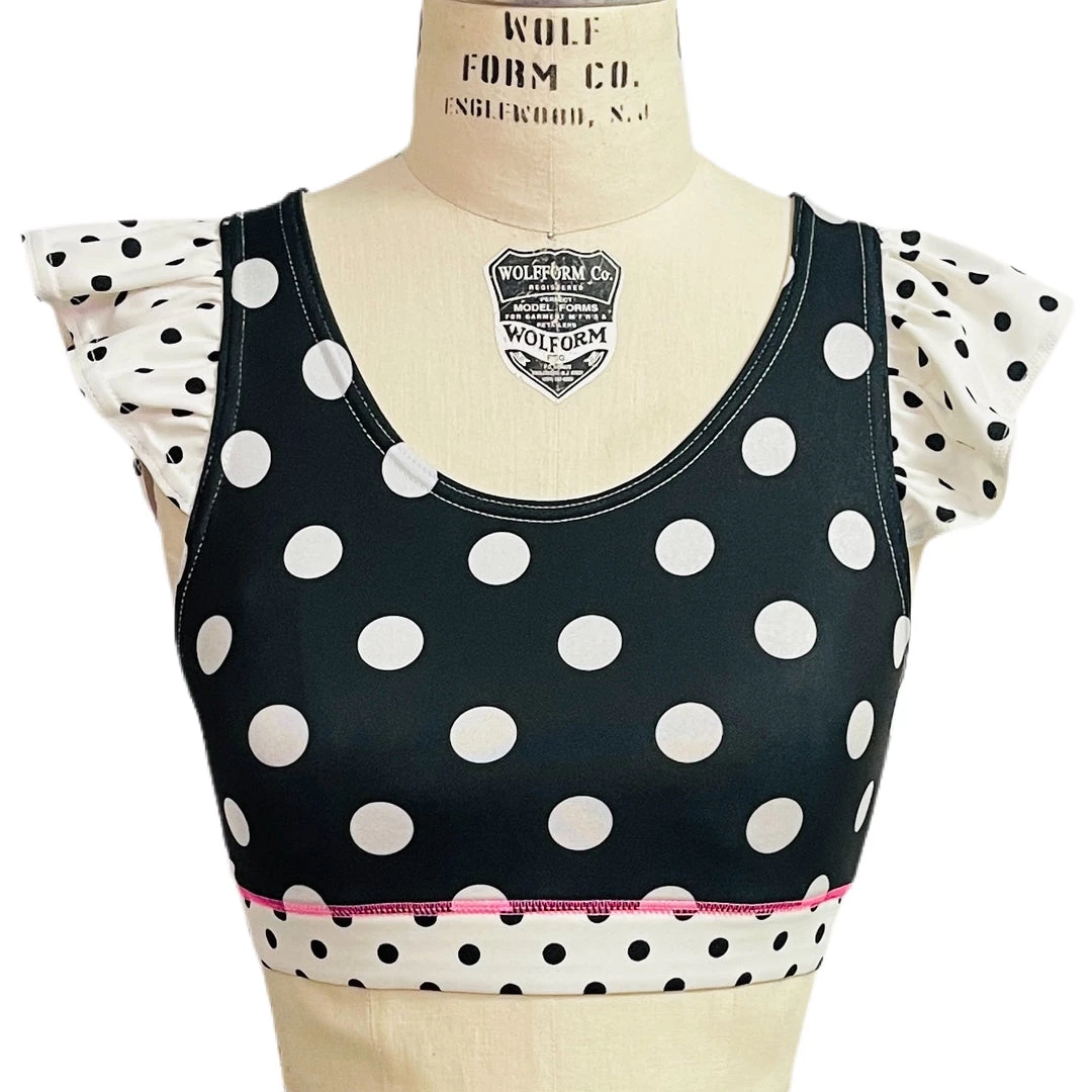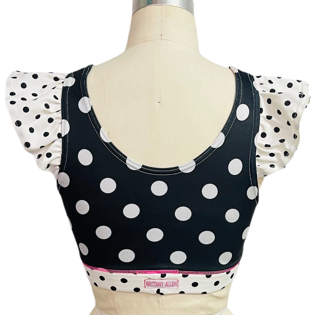 The Polka Dot Ruffle Sports Bra is made of a matte spandex that is smooth and soft as butter. This bra comes in three different cuts: crew neck, scoop neck, and shoulder. The bra features an encased elastic waistband, ruffle sleeves, fully lined interior, and coverstitching on the band seam to ensure no elastic twists and turns.