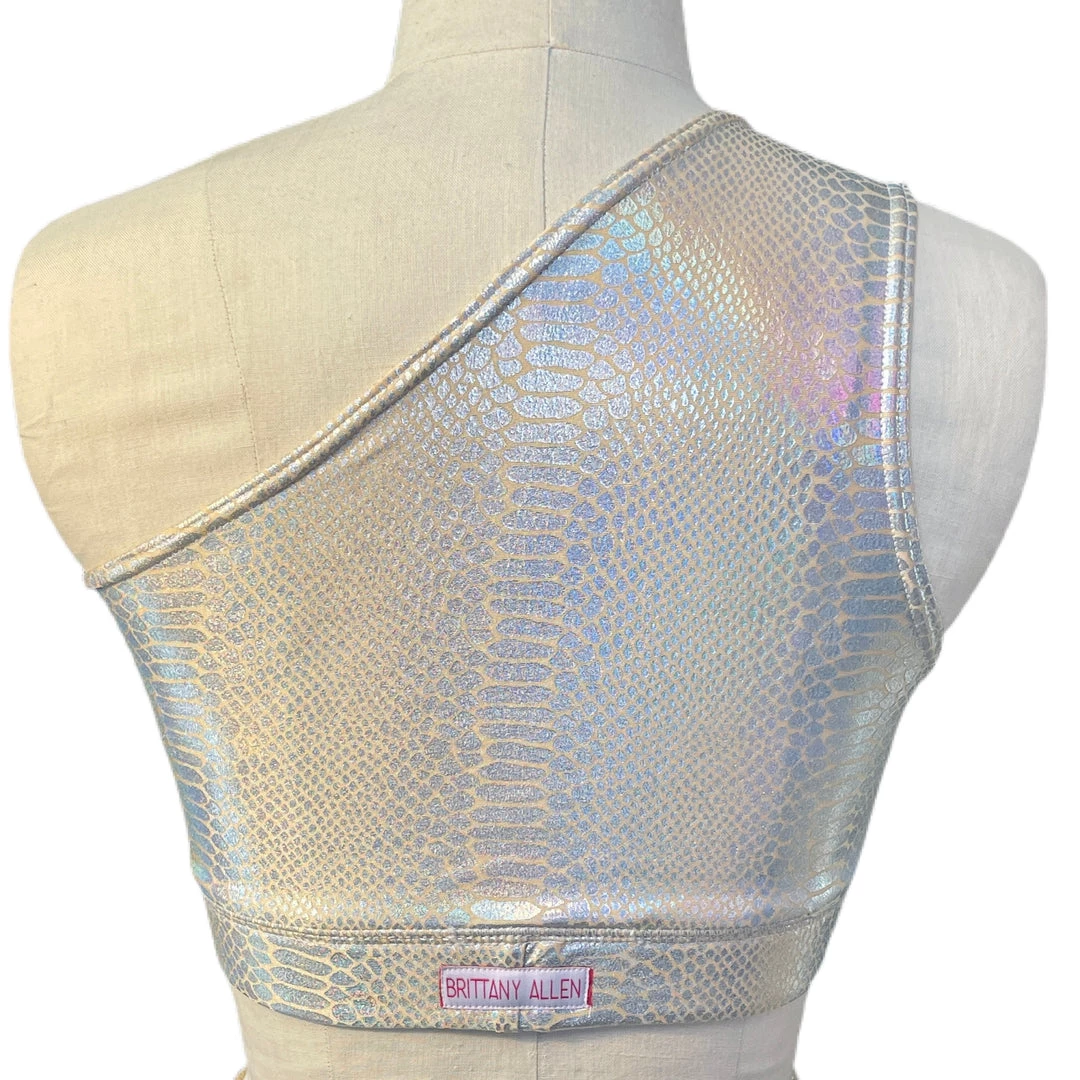 The Venom Shoulder Sports Bra is made with a metallic holographic foil printed on spandex. The bra has a one shoulder cut, encased elastic waistband, fully lined interior, and coverstitching on the band seam to ensure no elastic twists and turns.Â