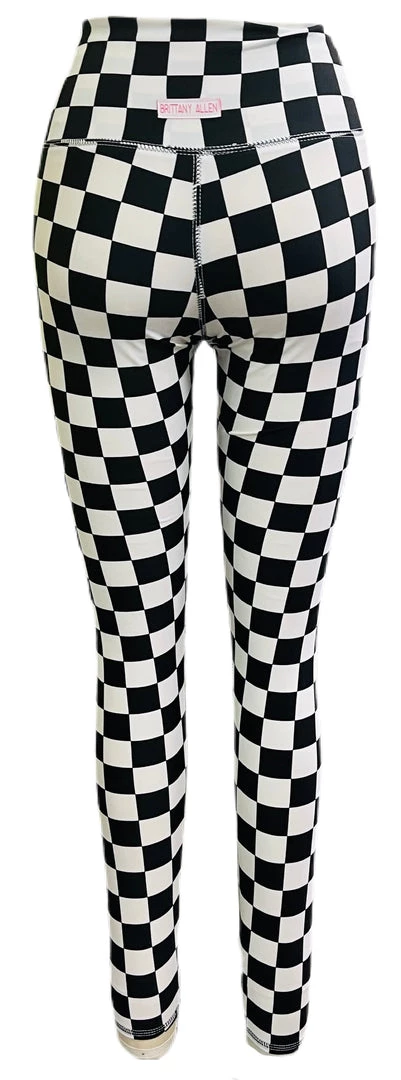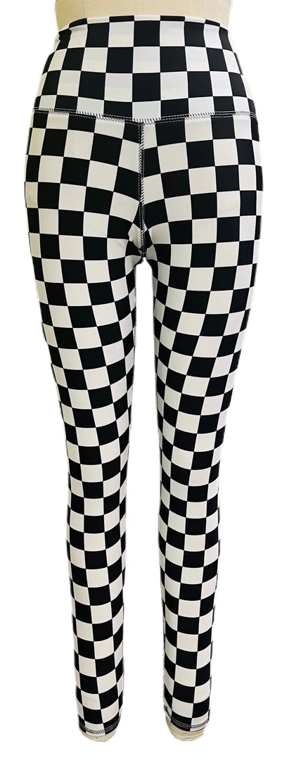 These leggings are made of a black and white checkerboard printed spandex. This garment features a “control top” waistband.