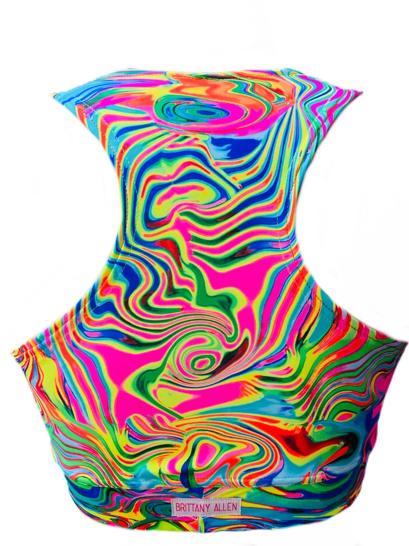 ThisĀ bra is made ofĀ a multicolored, chromatic psychedelic spandex that glows under a blacklight. This garment features a built in, covered spandex waistband, a higher crewneck neckline, spandex lining, andĀ racerback design in the back.
