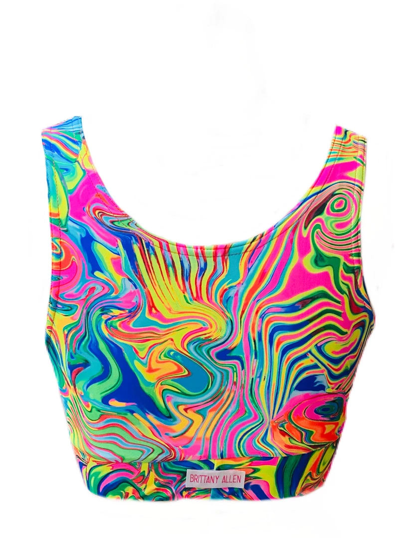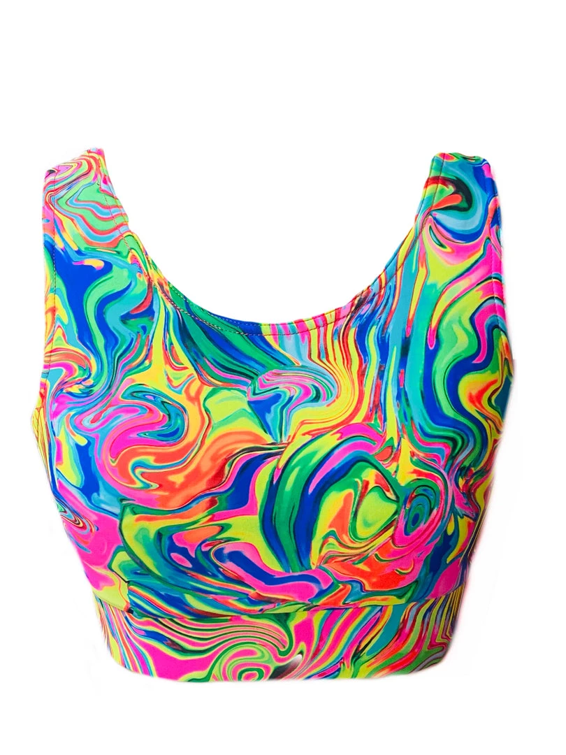 This bra is made of a multicolored, chromatic psychedelic spandex that glows under a blacklight. This garment features a built in, covered spandex waistband, a lower scoop neckline, spandex lining, and scoop design in the back as well as the front.
