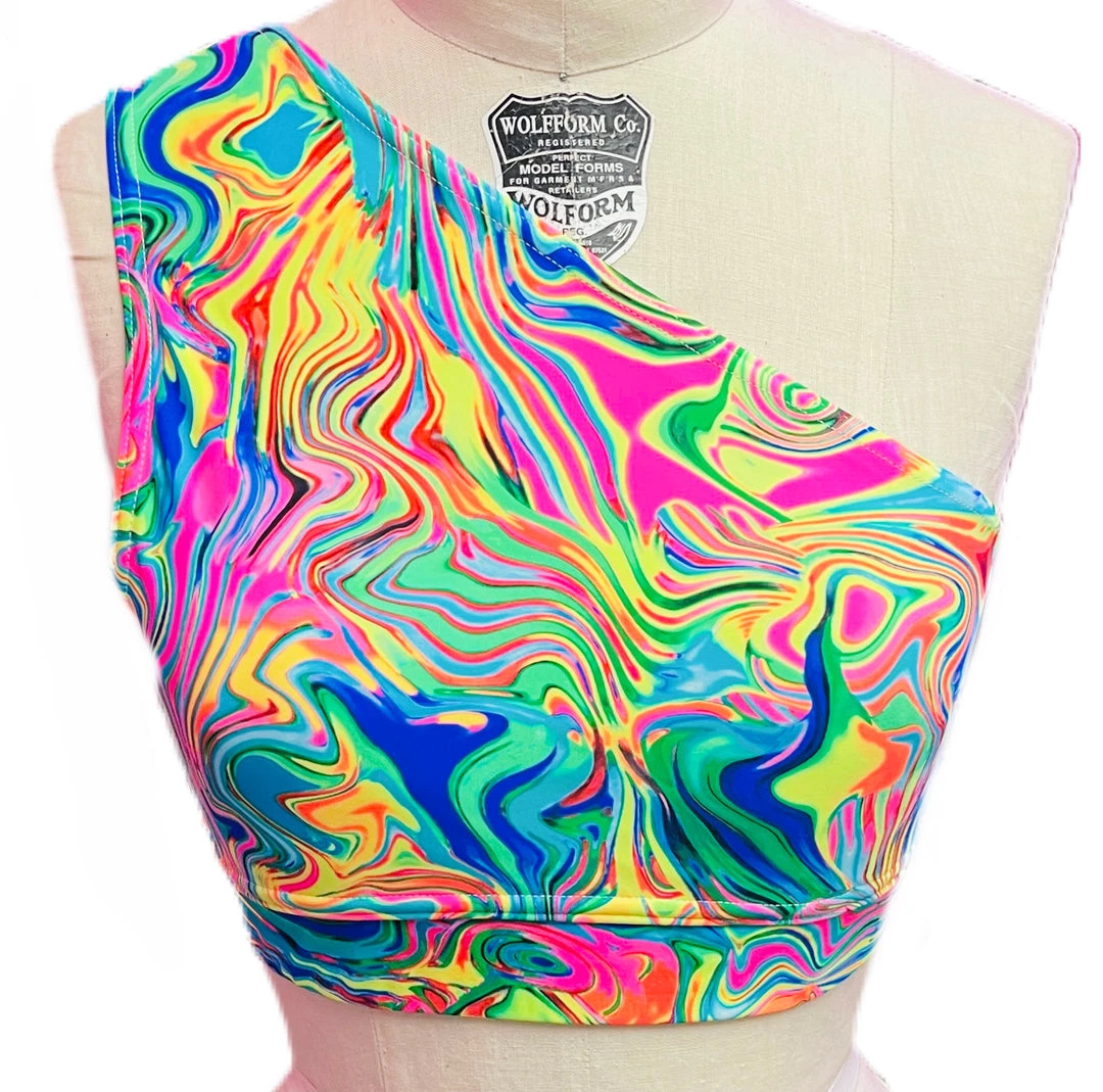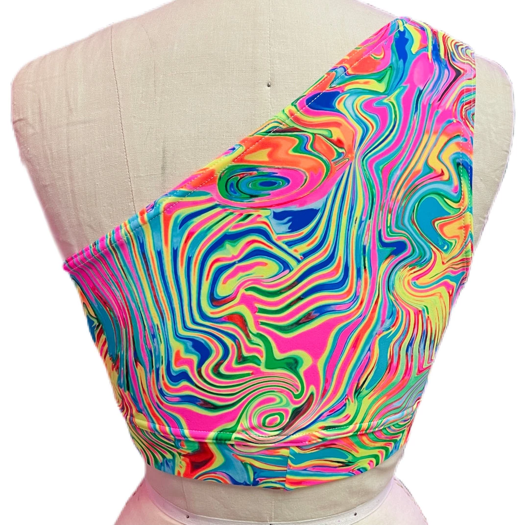 This bra is made of a multicolored, chromatic psychedelic spandex that glows under a blacklight. This garment features a built in, covered spandex waistband, a one shoulder neckline, and spandex lining.