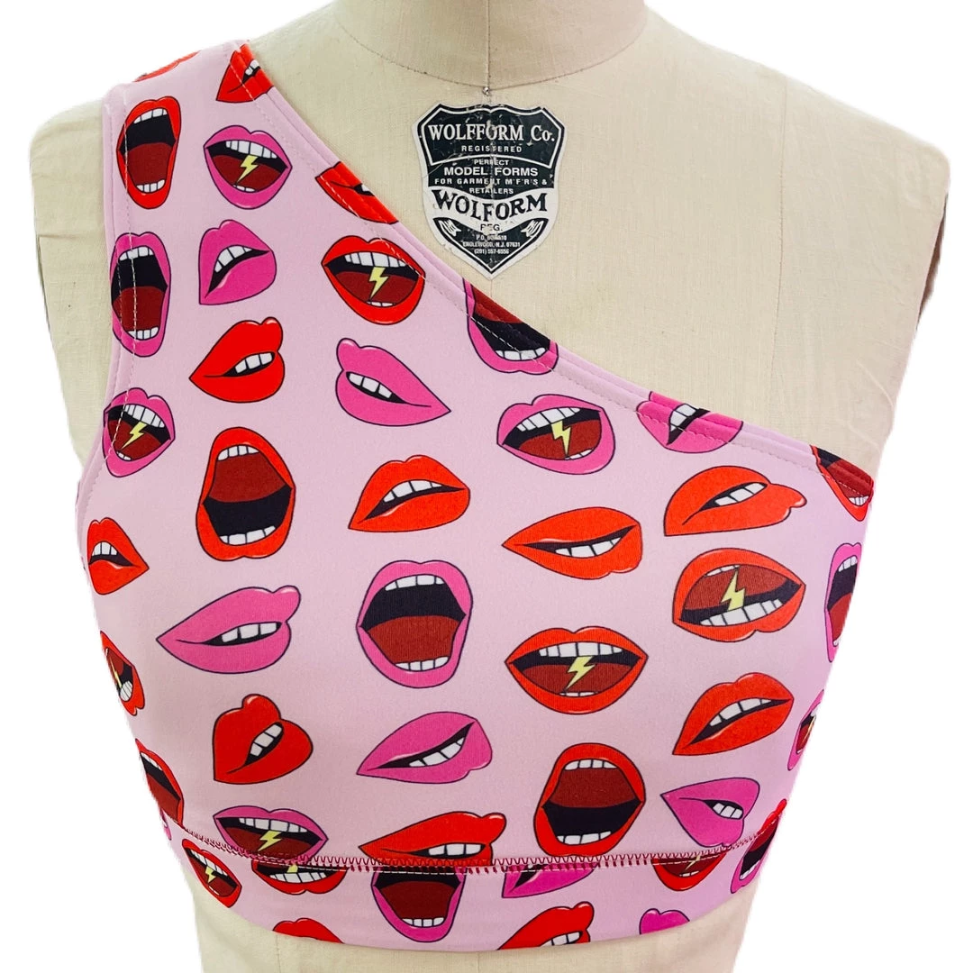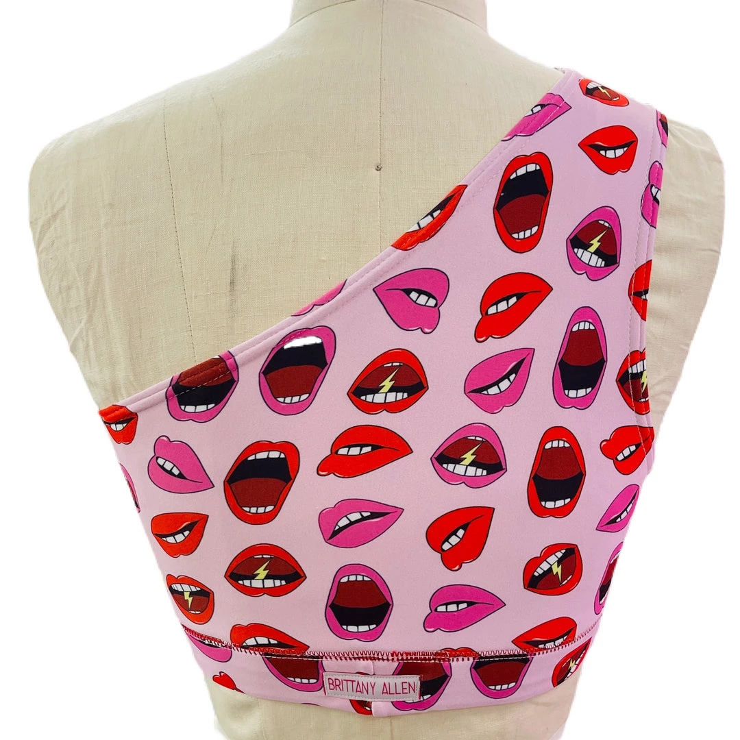 The DA x BA Electric Lips Sports Bra is made of a matte spandex that is smooth and soft as butter. This bra comes in three different cuts: crew neck, scoop neck, and shoulder. The bra is a custom print created by Dani Aziz and is designed and constructed by the Brittany Allen brand. The bra features an encased elastic waistband, fully lined interior, and coverstitching on the band seam to ensure no elastic twists and turns.