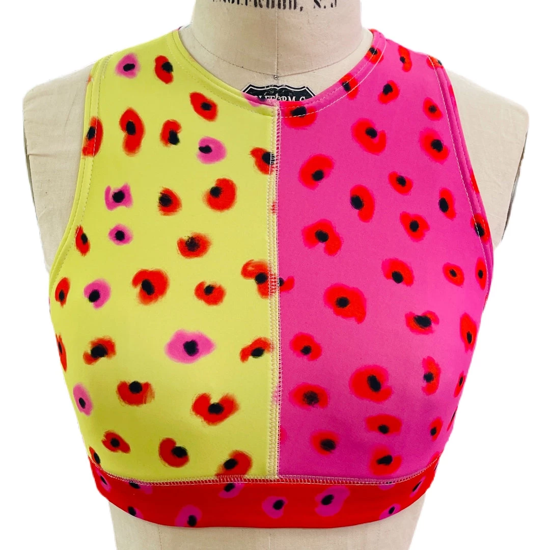 The DA x BA Seeing Spots Sports Bra is made of a matte spandex that is smooth and soft as butter. This bra comes in three different cuts: crew neck, scoop neck, and shoulder. The bra is a custom print created by Dani Aziz and is designed and constructed by the Brittany Allen brand. The bra features color blocked panels, an encased elastic waistband, fully lined interior, and coverstitching on the band seam to ensure no elastic twists and turns.