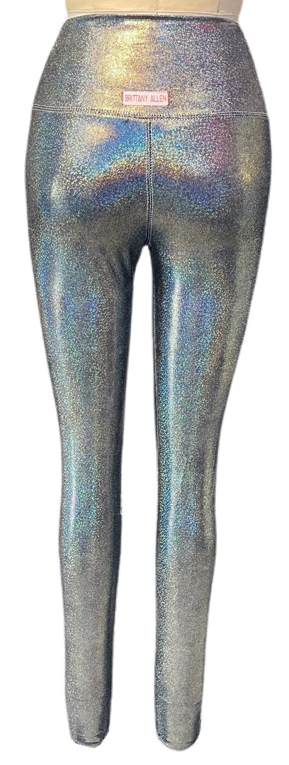 The Galactic Leggings are made with a rainbow mystique metallic spandex, looped coverstitching on all seams, and features a control-top, built-in waistband.
