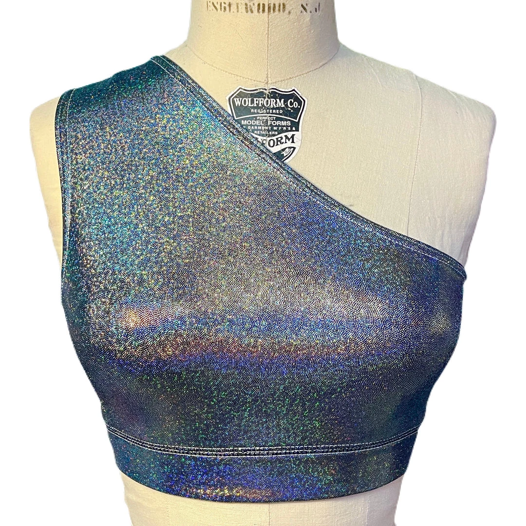 The Galactic Shoulder Sports Bra is made with a rainbow mystique metallic spandex. The bra has a one shoulder silhouette, encased elastic waistband, fully lined interior, and coverstitching on the band seam to ensure no elastic twists and turns.