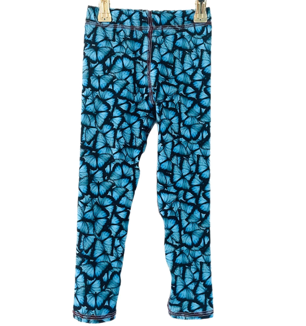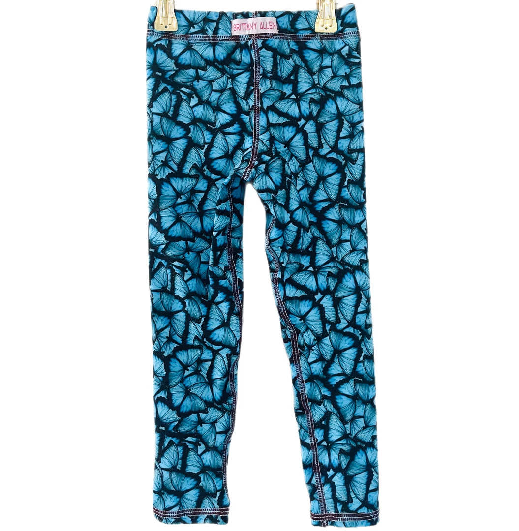 The Blue Butterfly Leggings are made of a matte spandex that is smooth and soft as butter. These have looped coverstitching on all seams and has a built in elastic waistband. All children’s leggings come standard full length and cannot be altered.