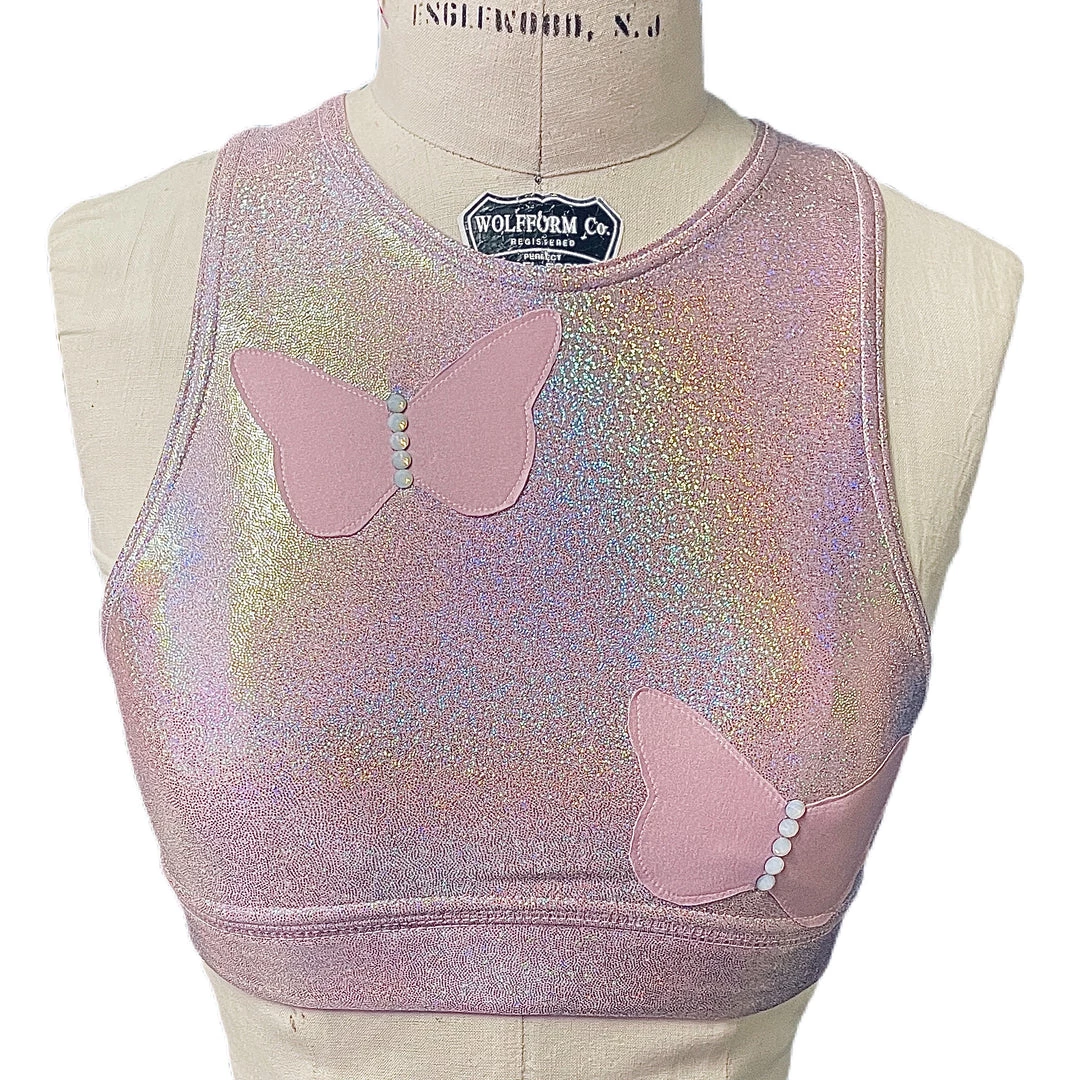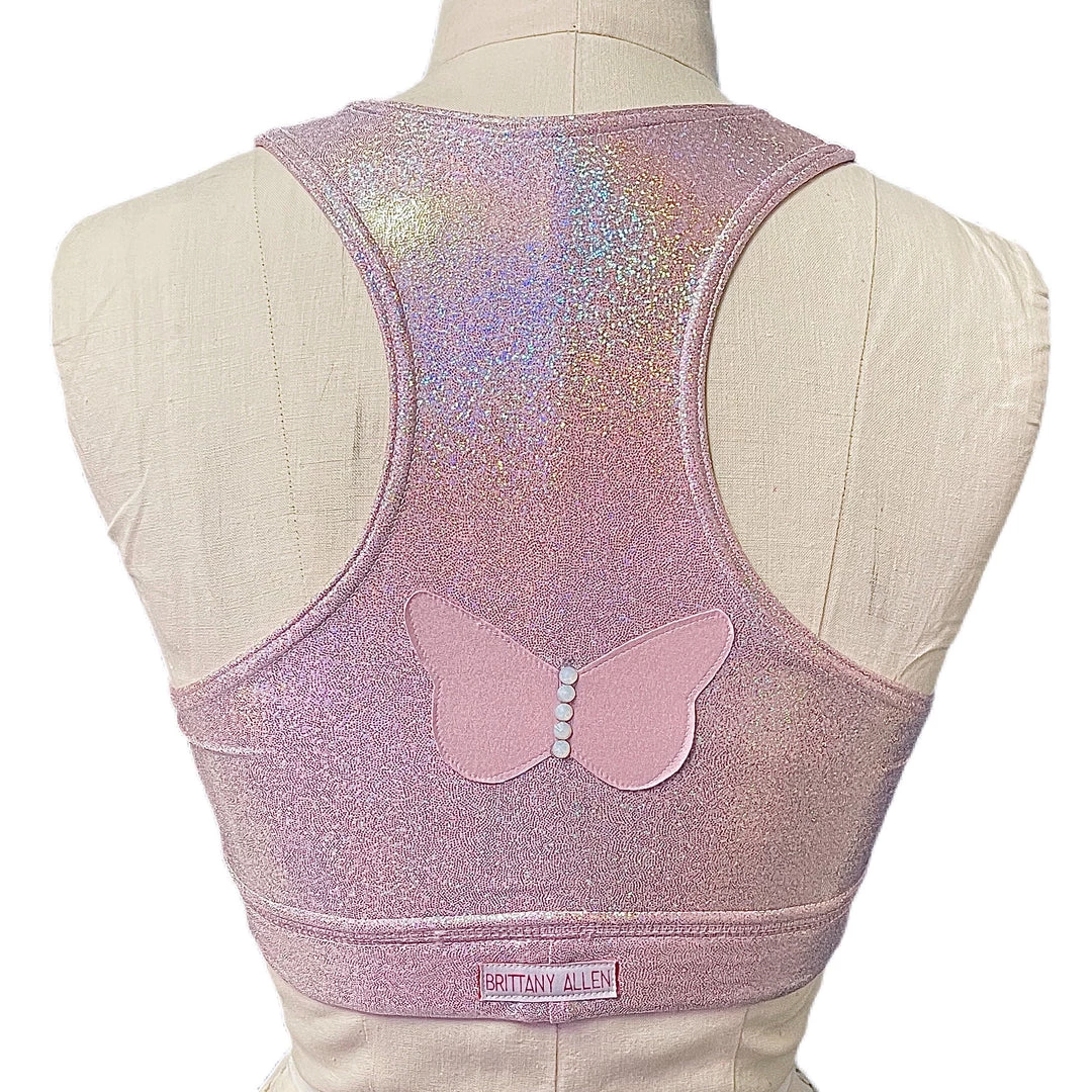 The Mariposa Pastel Crew Neck Sports Bra is made with a pastel pink diamond mystique metallic spandex with spandex butterfly appliqués and finished with some rhinestones down the middle of the butterflies for a little extra sparkle. The bra has a racerback style back, encased elastic waistband, fully lined interior, and coverstitching on the band seam to ensure no elastic twists and turns.