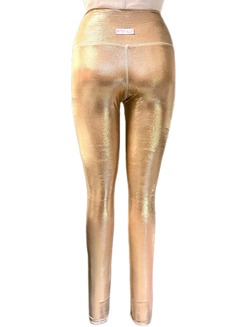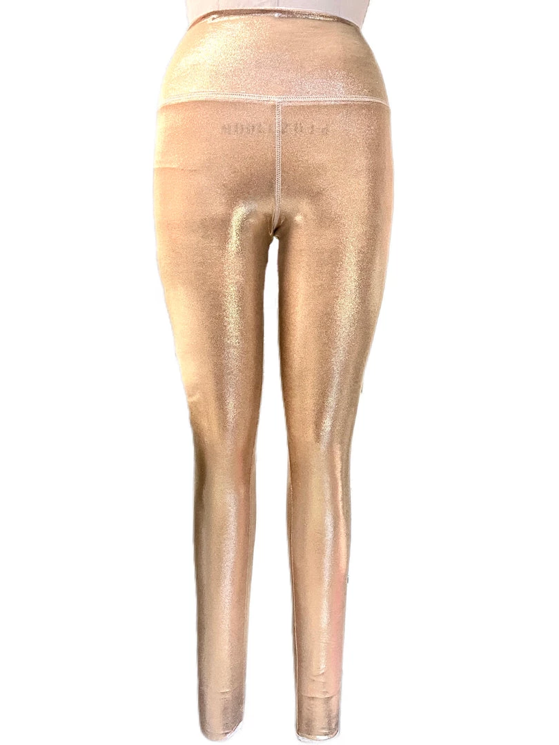 These metallic leggings are made with a mystique metallic spandex spandex, looped coverstitching on the waistband and crotch seams, and features a built in waistband.Â