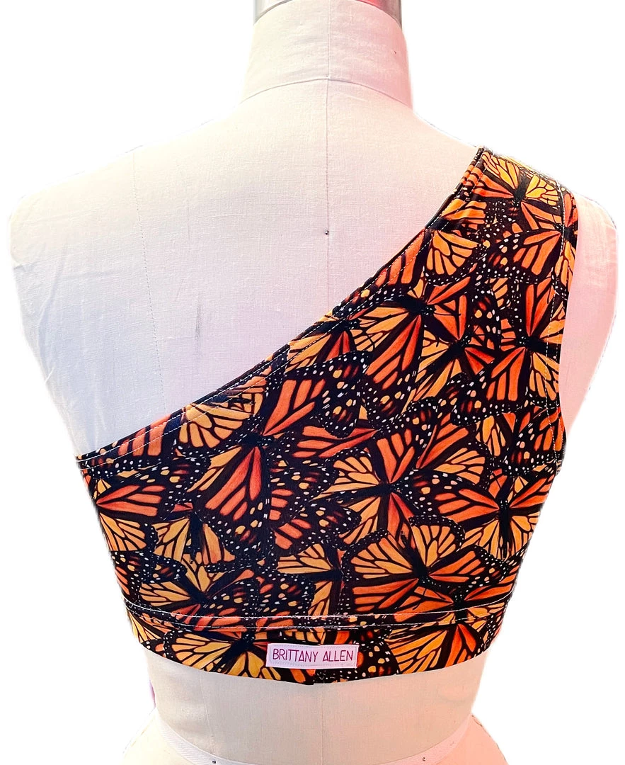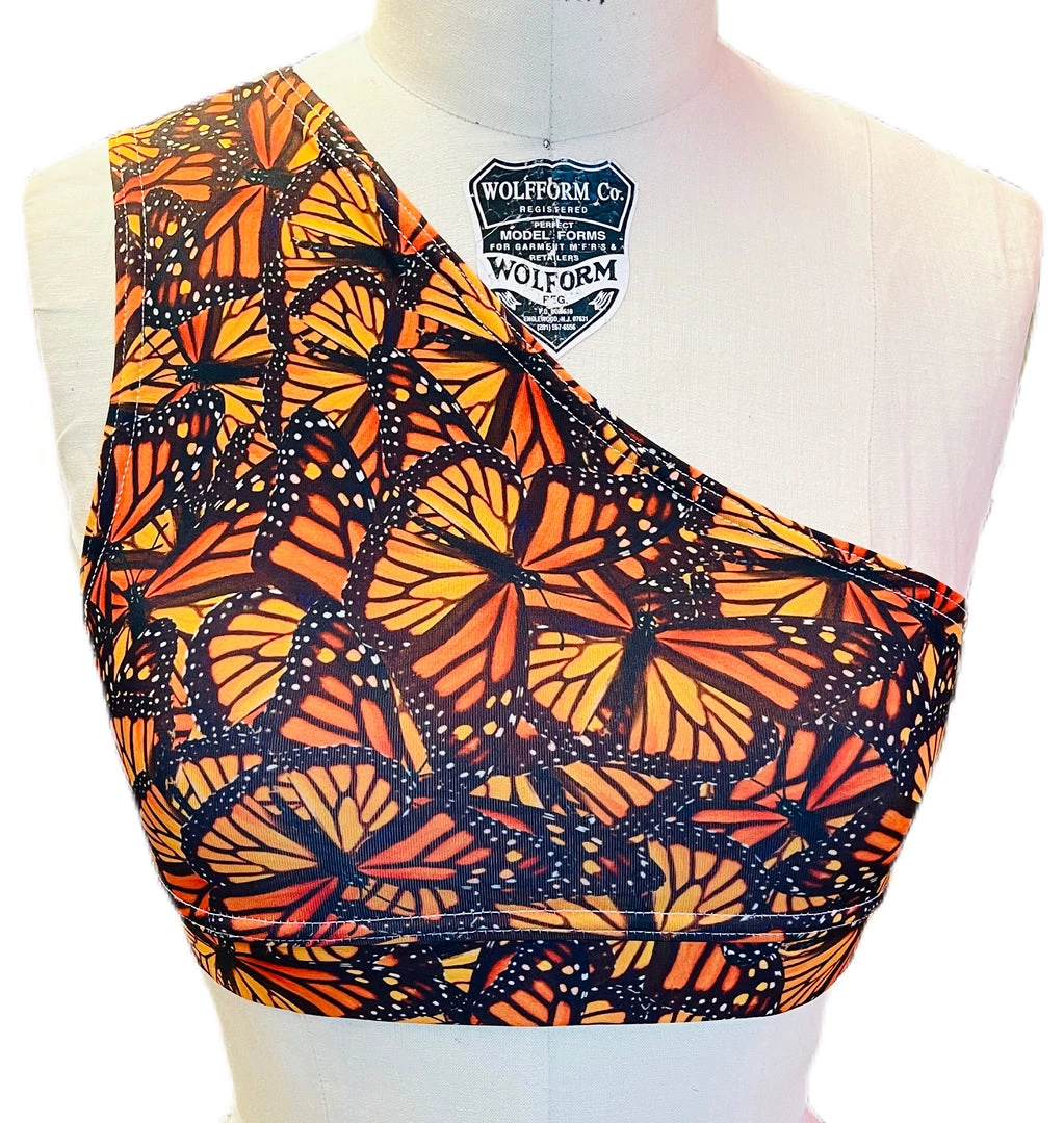 This monarch one shoulder sports bra is made with our brand’s exclusive monarch printed spandex with a lining and built in covered elastic band.Â