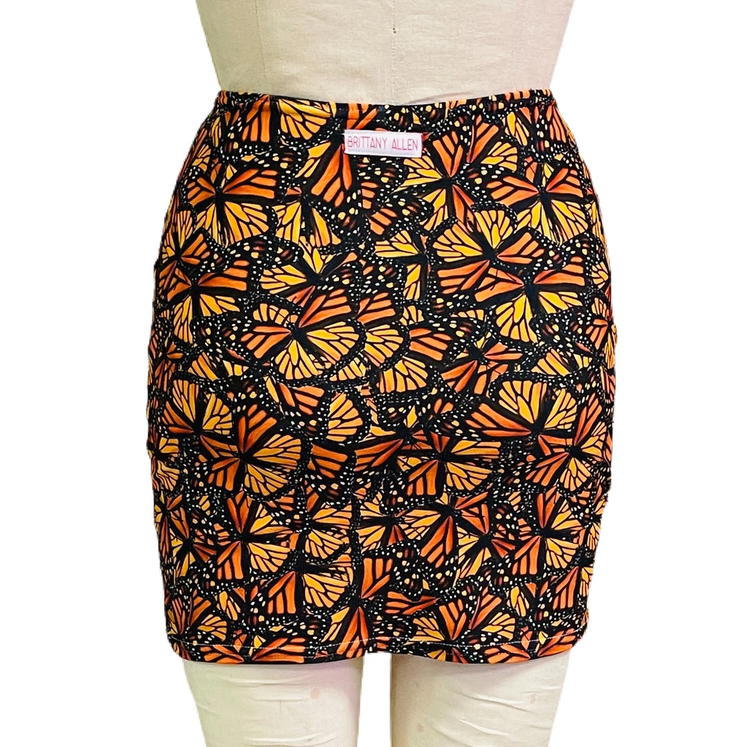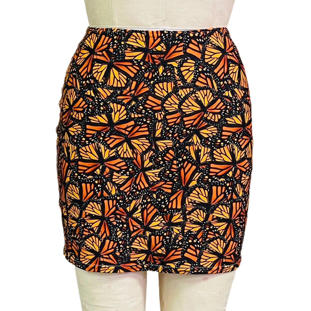 The “Monarch Spandex Mini Skirt” is simply a slip on skirt made in a printed spandex that hugs the hips and legs. Skirt is a slip on, and there are no closures. It’s so easy to wear with just about any outfit. Fit model height is 5’6″ and skirt length from waist to hem is as follows:
