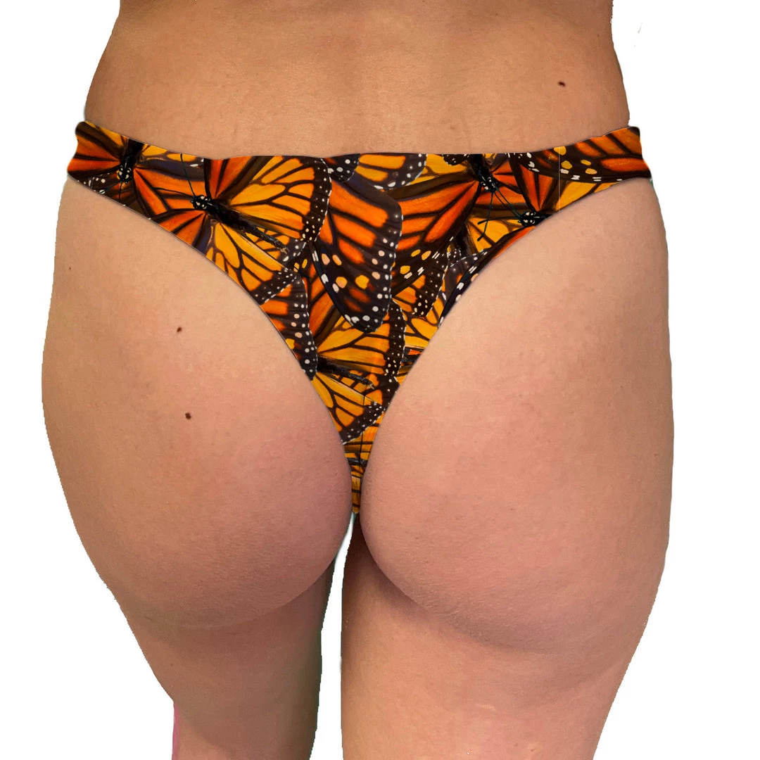 This thong swim bottom sits perfectly on the hip, and the leg openings in the back cut into a thong.Â