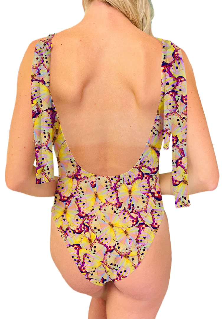 This swimsuit features a low cut front and deep cut back. The straps are adjustable to accommodate all torso lengths. For the bottom of the swimsuit, the leg openings are a little higher cut to expose more leg and include elastic in the leg opening for a better fit.Â