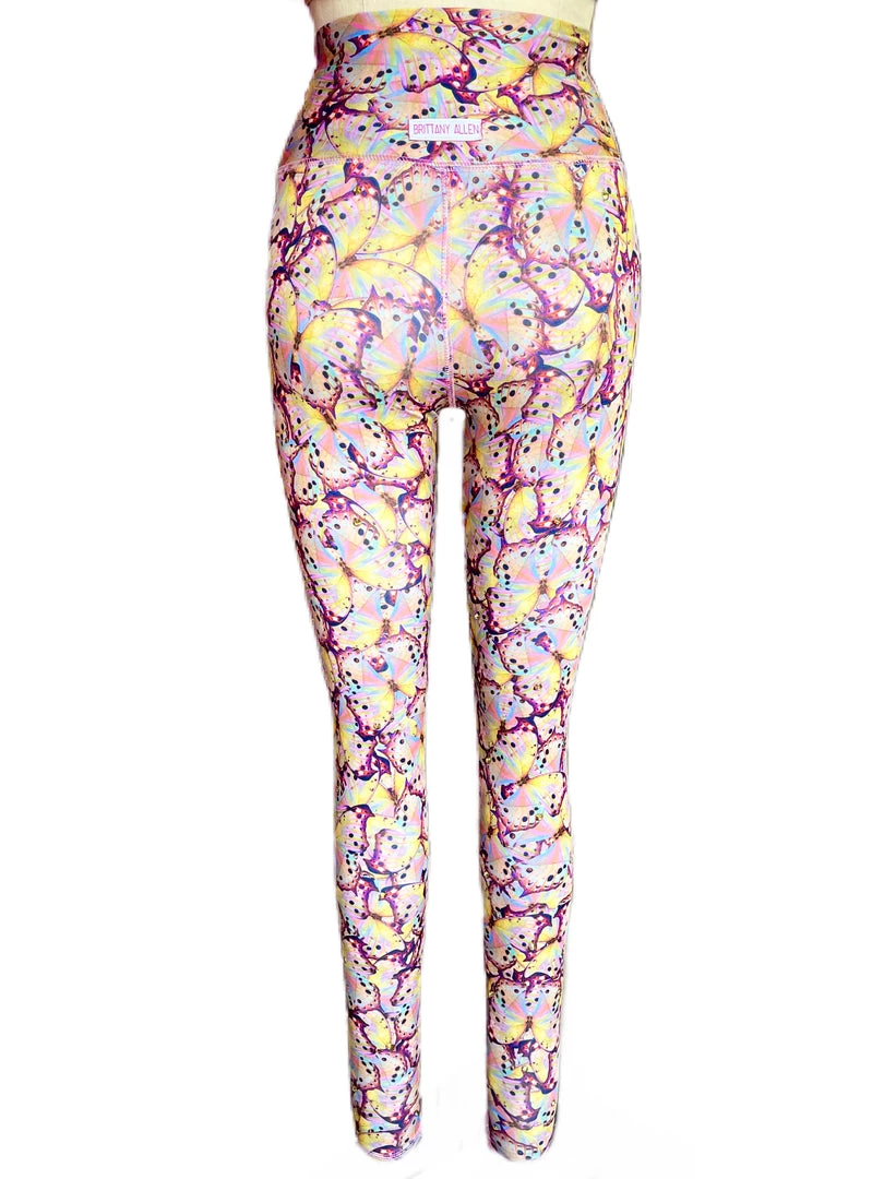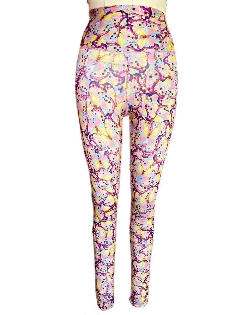 We stan a sustainable boss babe! The pink butterfly legging is made with our brand’s exclusive pink butterfly printed spandex, which is composed of 84% recycled water bottles, and 16% spandex. It has a built in waistband and is topped with scattered “ghost light” rhinestones for a little sparkle in your life. The rhinestone leggings have an inseam of 29 inches.Â