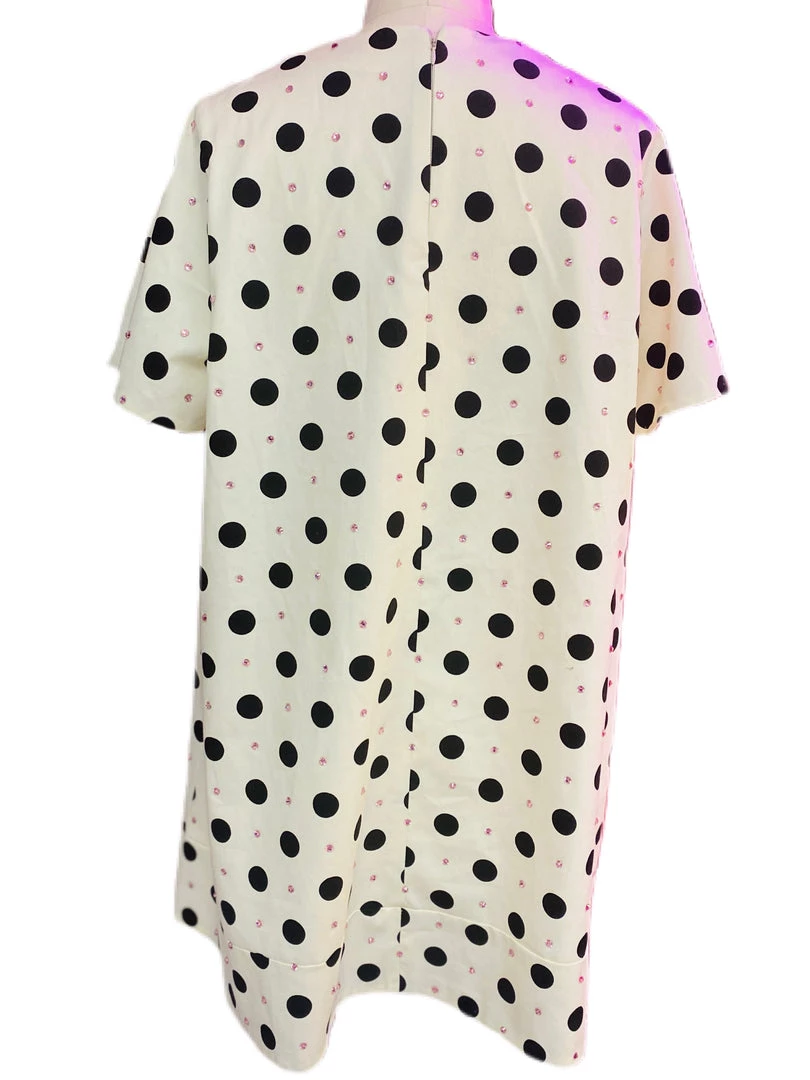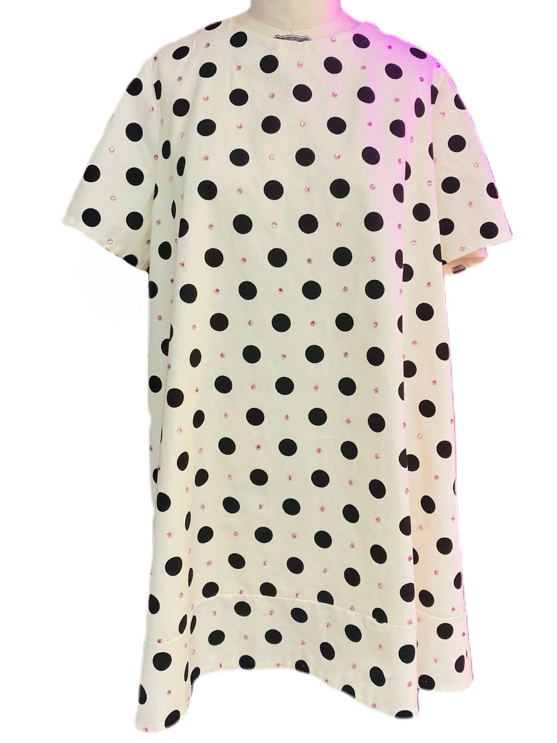 The “Polka Dot Tent Dress” is a dress made from cotton canvas twill with polka-dot printed pattern on the outside. The sleeves are slightly flared at the sleeve hem. Between each dot, there are hand placed rhinestones glued for extra sparkle.