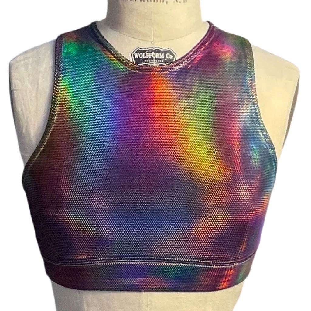 The Rave Crew Neck Sports Bra is made with a rainbow holographic, metallic spandex. The bra has a racerback style back, encased elastic waistband, fully lined interior, and coverstitching on the band seam to ensure no elastic twists and turns.