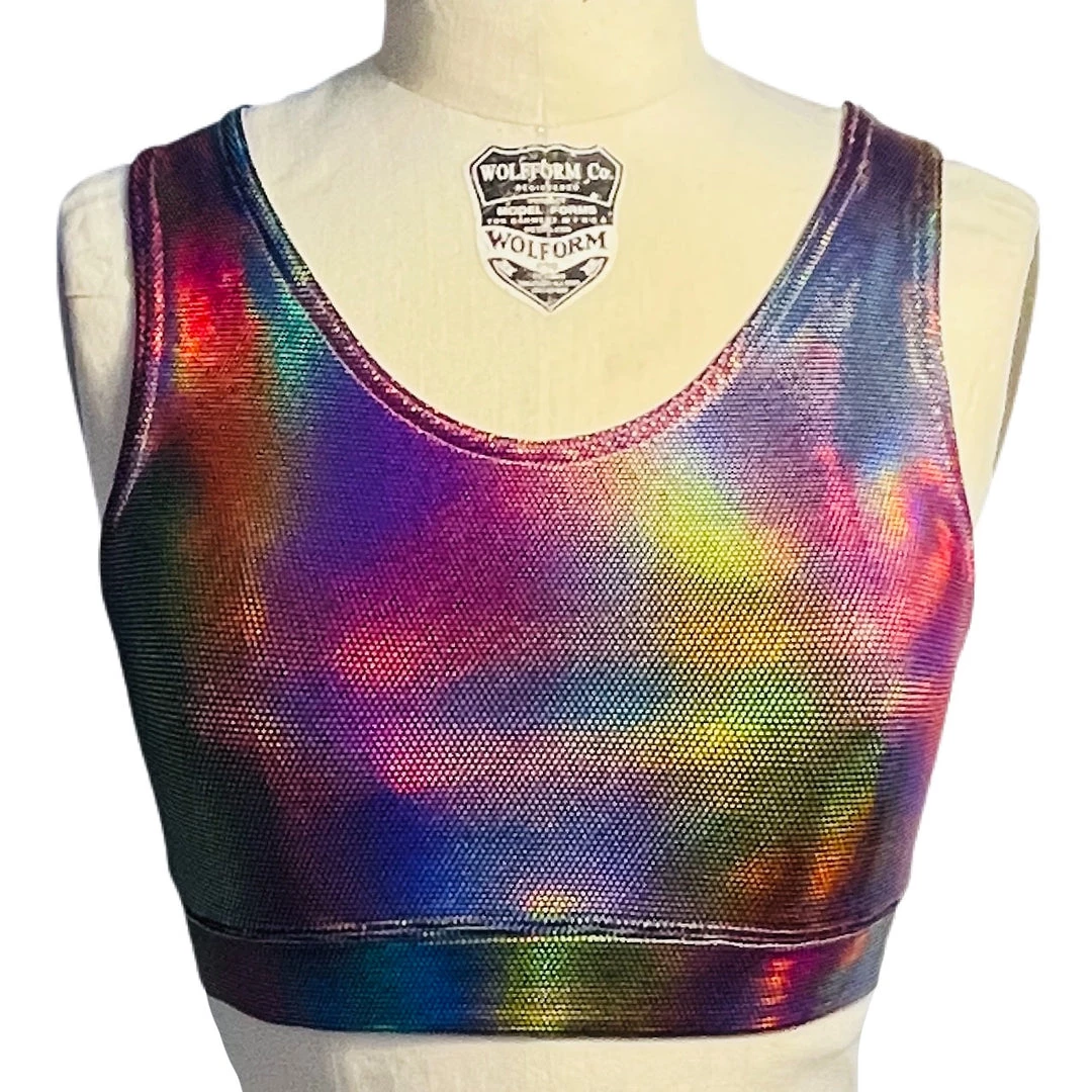 The Rave Scoop Neck Sports Bra is made with a rainbow holographic, metallic spandex. The bra has a scooped neckline style on the front and back, encased elastic waistband, fully lined interior, and coverstitching on the band seam to ensure no elastic twists and turns.