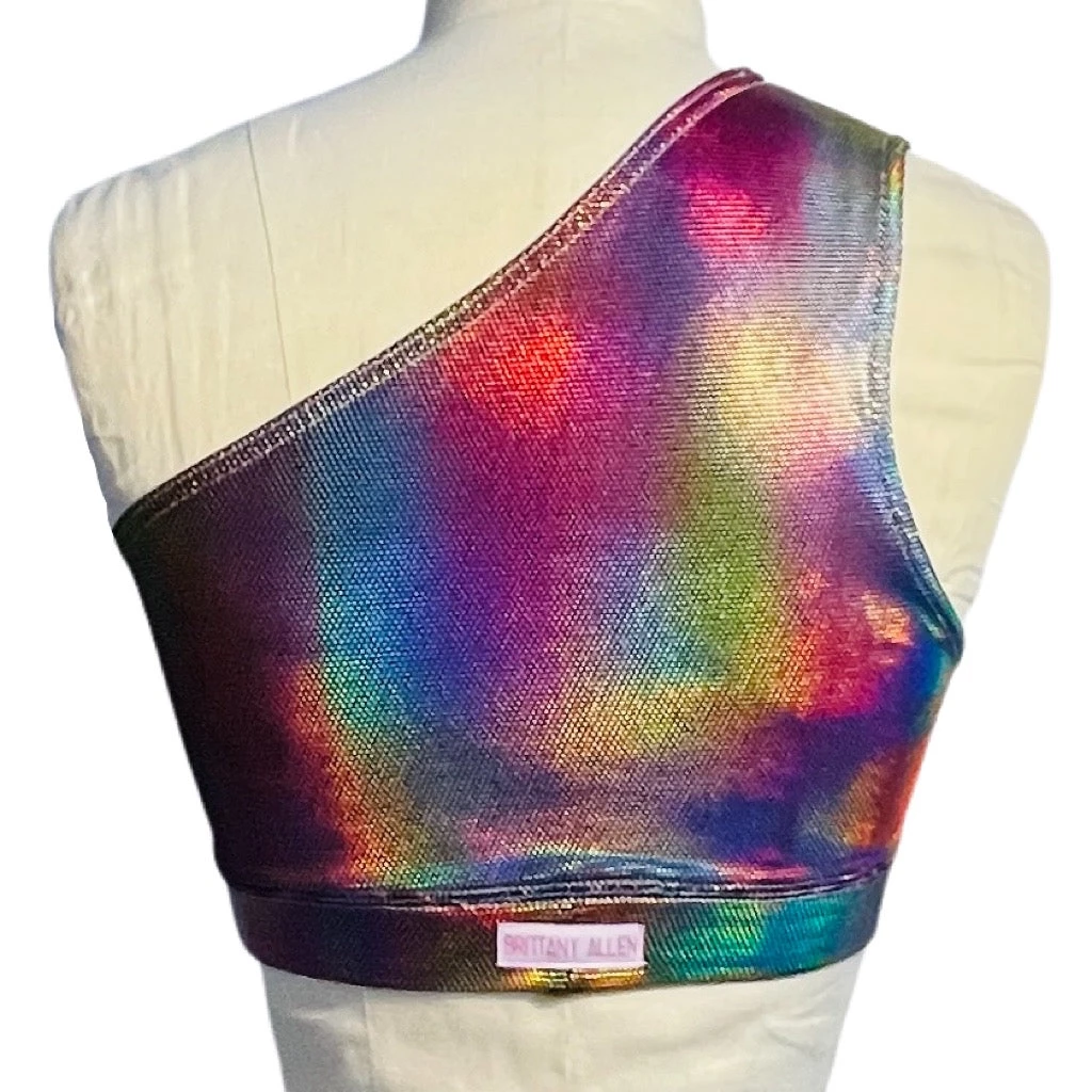 The Rave Shoulder Sports Bra is made with a rainbow holographic, metallic spandex. The bra has a one shoulder silhouette, encased elastic waistband, fully lined interior, and coverstitching on the band seam to ensure no elastic twists and turns.
