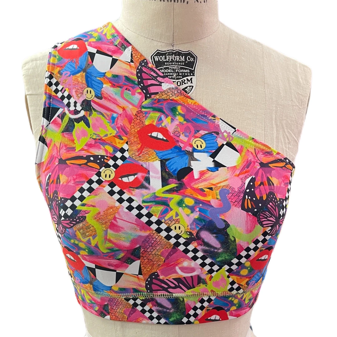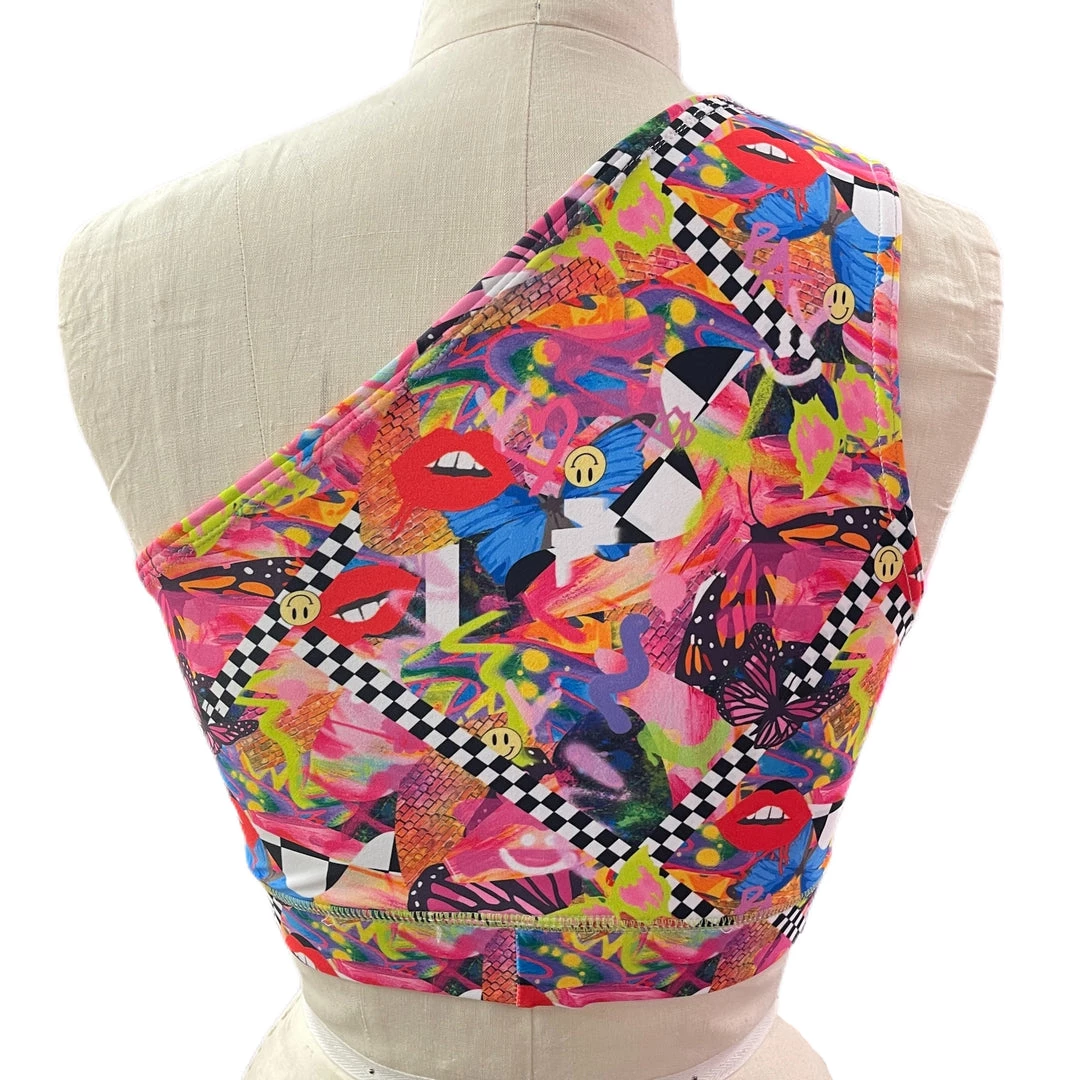 The Rebel Shoulder Sports Bra is made of a matte spandex that is smooth and soft as butter. The bra features an encased elastic waistband, ruffle fully lined interior, and coverstitching on the band seam to ensure no elastic twists and turns.