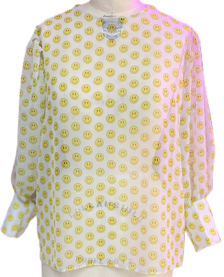 The “Smiley Face Sheer Blouse” is a boxy top that has gathered, full bishop-like sleeves. It is complete with a cuff at the hem of the sleeve. Top is sheer.