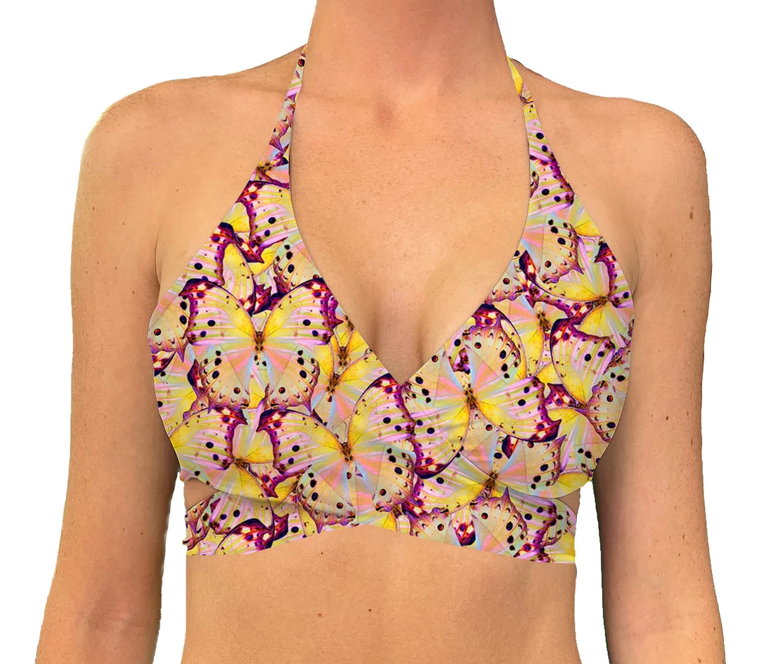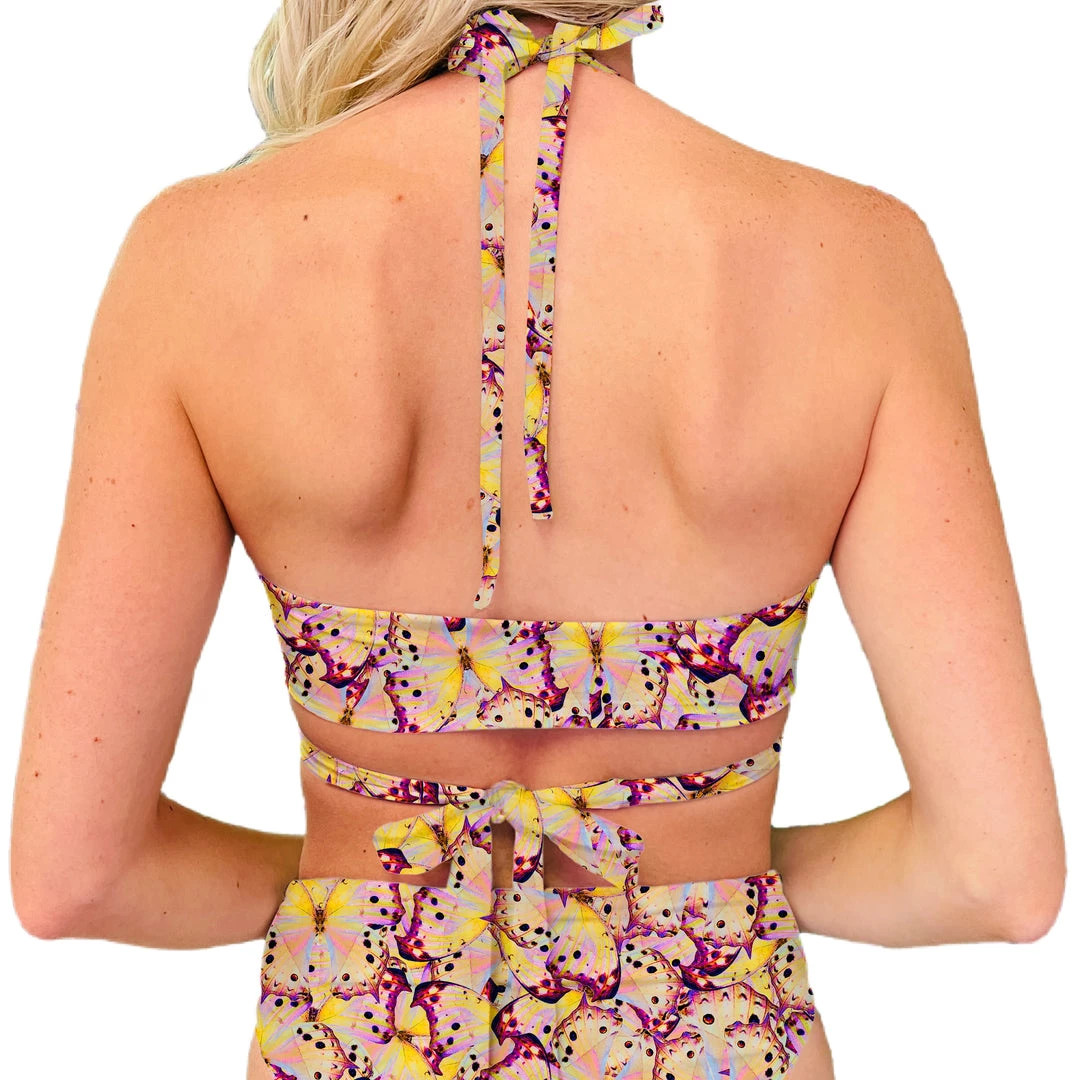This wrap swim top is a stylish twist on a string bikini, and it offers a little more coverage. Neck ties measures at 20 inches long in total each. The wrap top is designed to wrap around the waist and tie at the back.