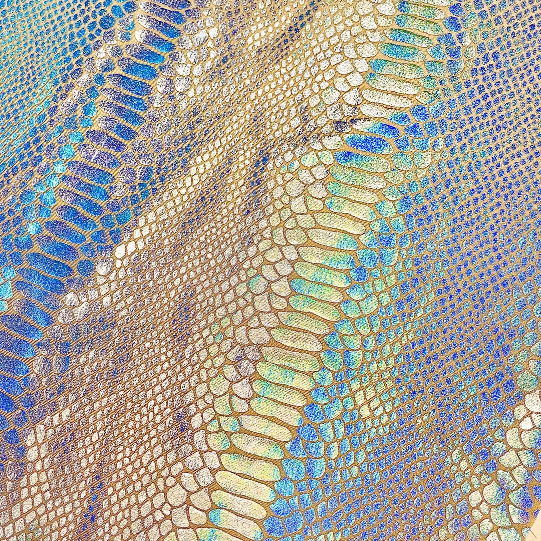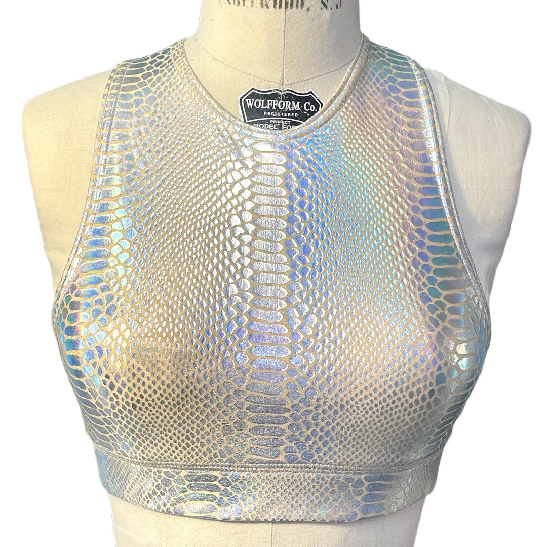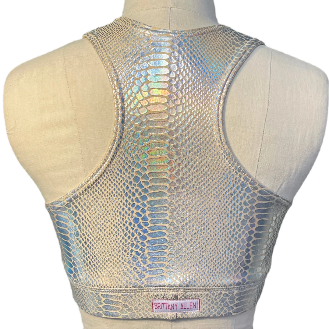 The Venom Crew Neck Sports Bra is made with a metallic holographic foil printed on spandex. The bra has a racerback style back, encased elastic waistband, fully lined interior, and coverstitching on the band seam to ensure no elastic twists and turns.