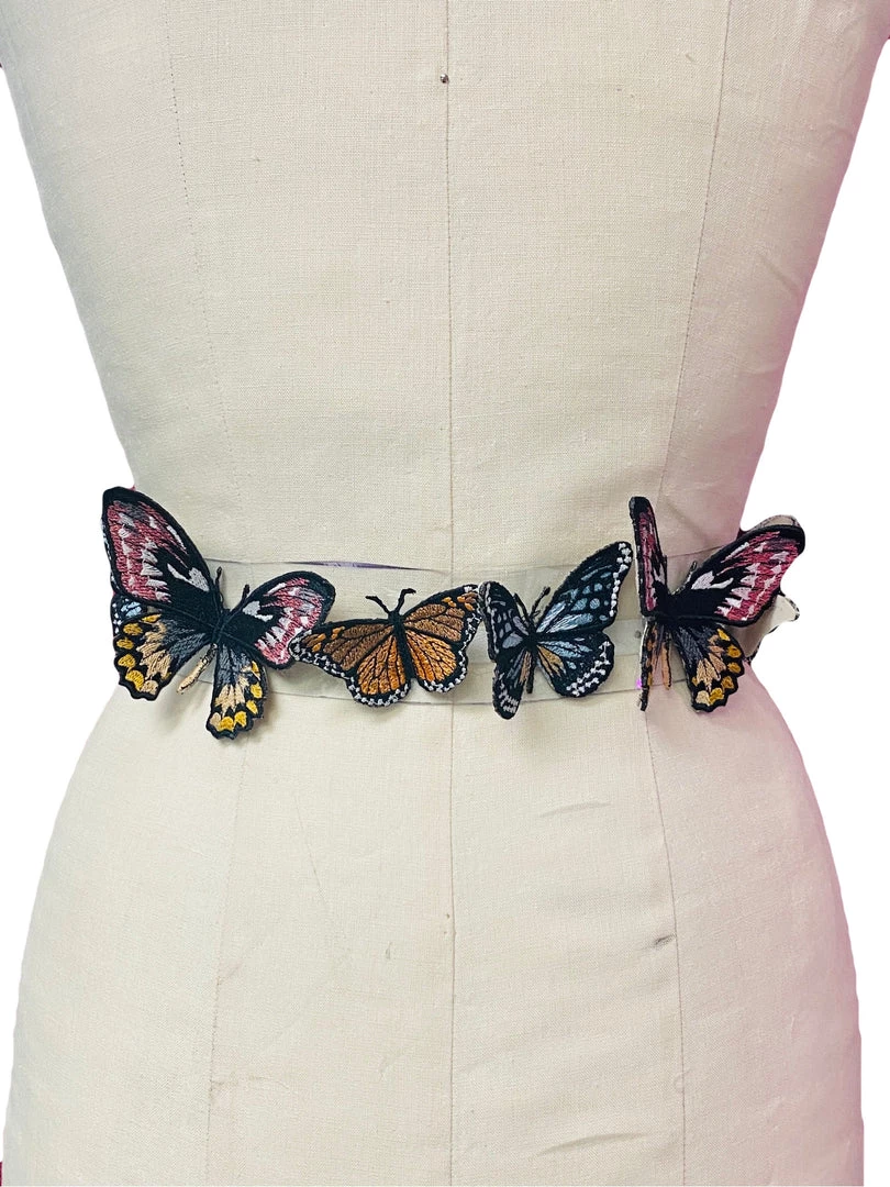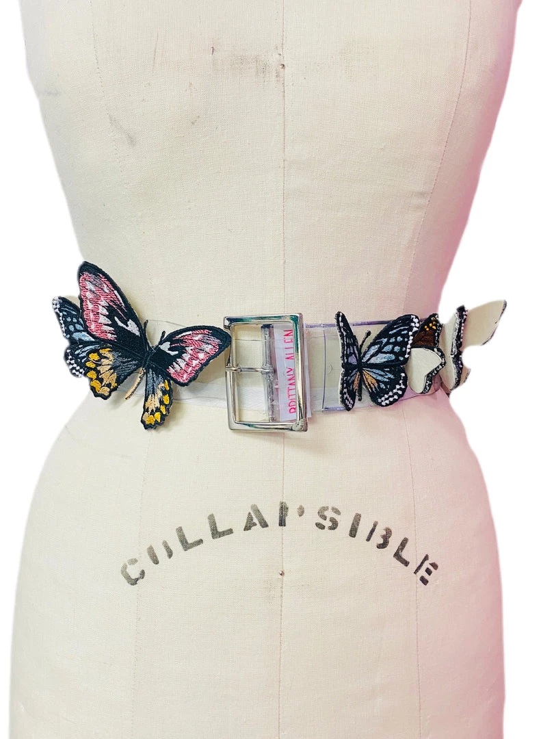Butterfly belt is created using clear vinyl for the belt, a silver metal buckle, and embroidered 3D butterflied made in house by the Brittany Allen team. Belt is adjustable to fit a variation of waist sizes by 2 inch increments.