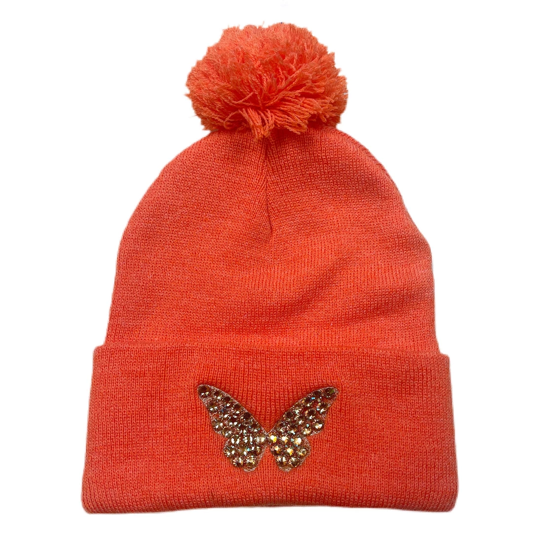 This beanie is embroidered with the outlined butterfly motif and topped with many “ghost light” rhinestones that change color as you move the stones from side to side.