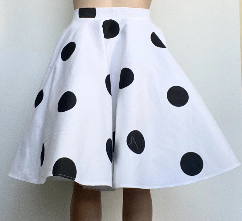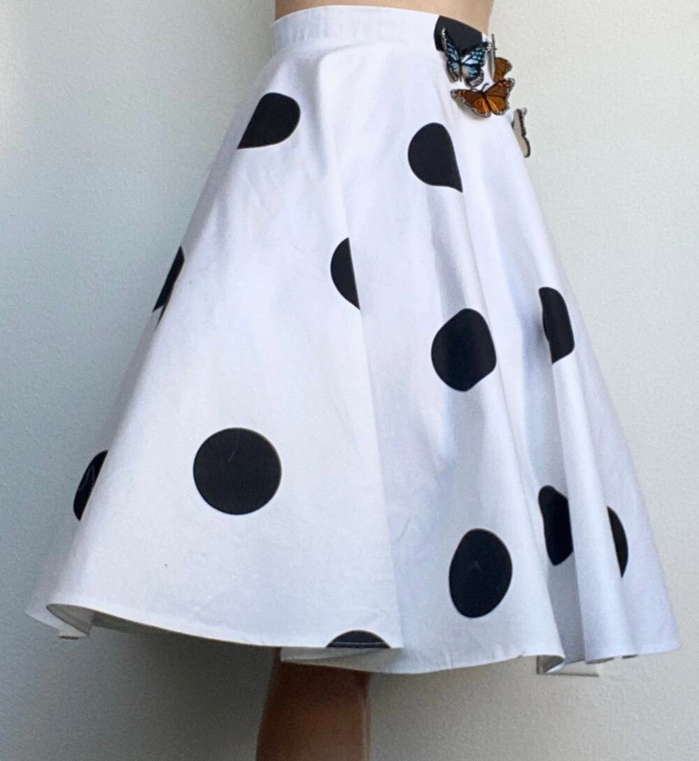 The skirt is a more simple version of the infamous skirt worn in the Fashion X Austin February 2019 show promo. The skirt is a circle skirt with printed polka dots and 3D embroidered patches sewn to cascade around the polka dots (patches made my Brittany Allen team). Skirt has a built-in petticoat.
