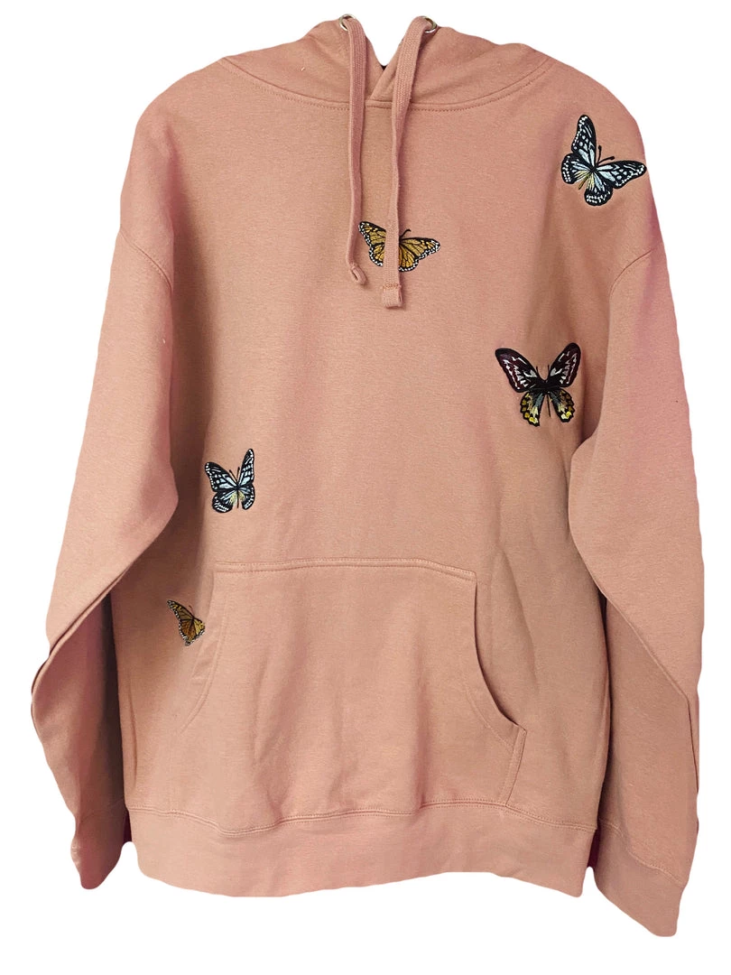This hoodie is for the daring + fun. The butterflies are machine embroidered and perfectly placed on the hoodie front. The embroidery is done in house by the Brittany Allen team.