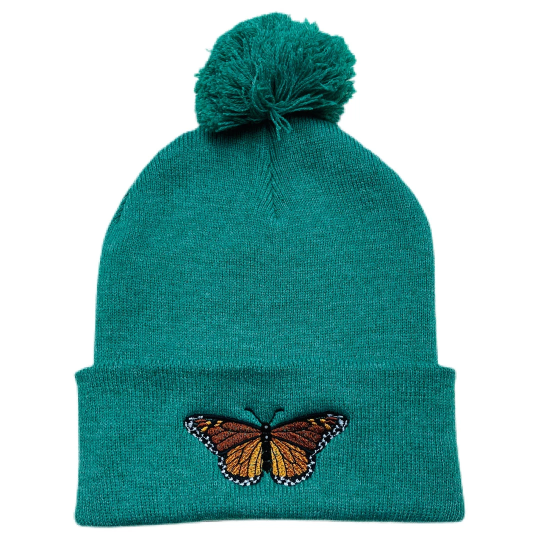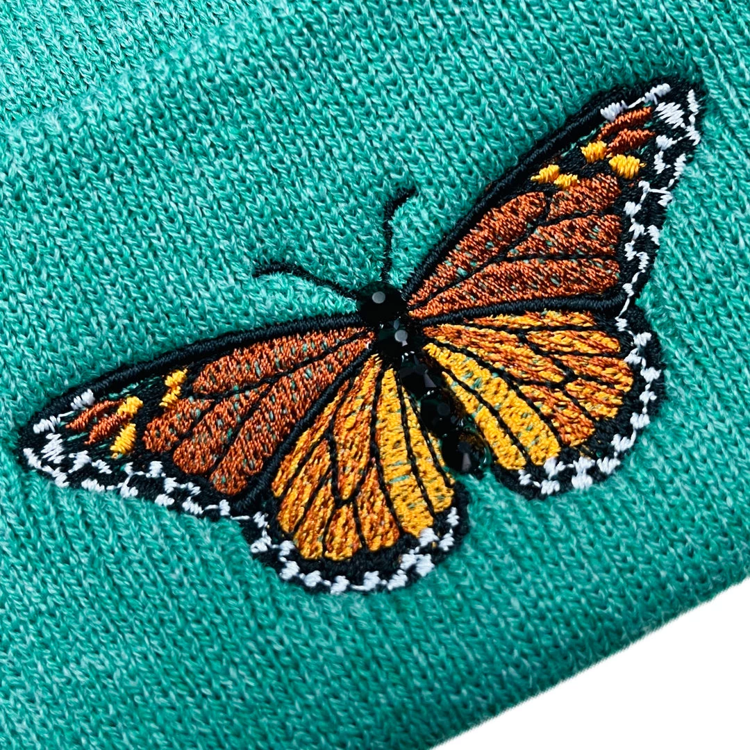This beanie is embroidered with a classic monarch butterfly and topped with black rhinestone crystals for a little sparkle.