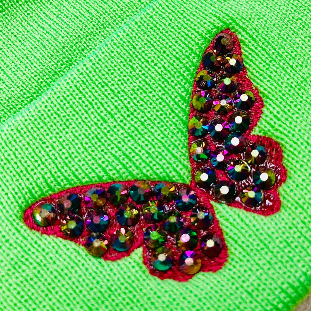 This beanie is embroidered with the outlined butterfly motif and topped with many “rainbow” rhinestones that change color as you move the stones from side to side.