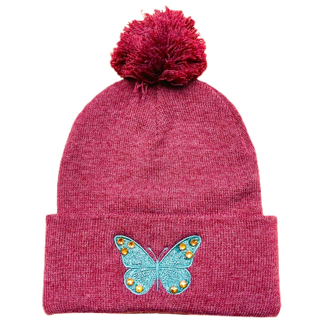 This beanie is embroidered with a monochromatic “pine green” butterfly and topped with “ghost light” rhinestone crystals for a little sparkle.