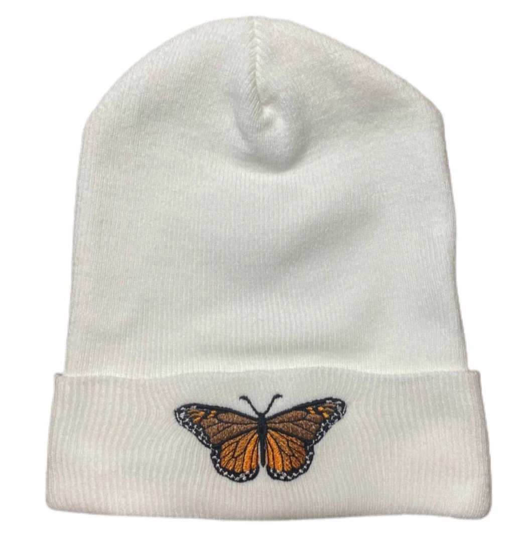 Beanies are embroidered with motifs in house by the Brittany Allen team.