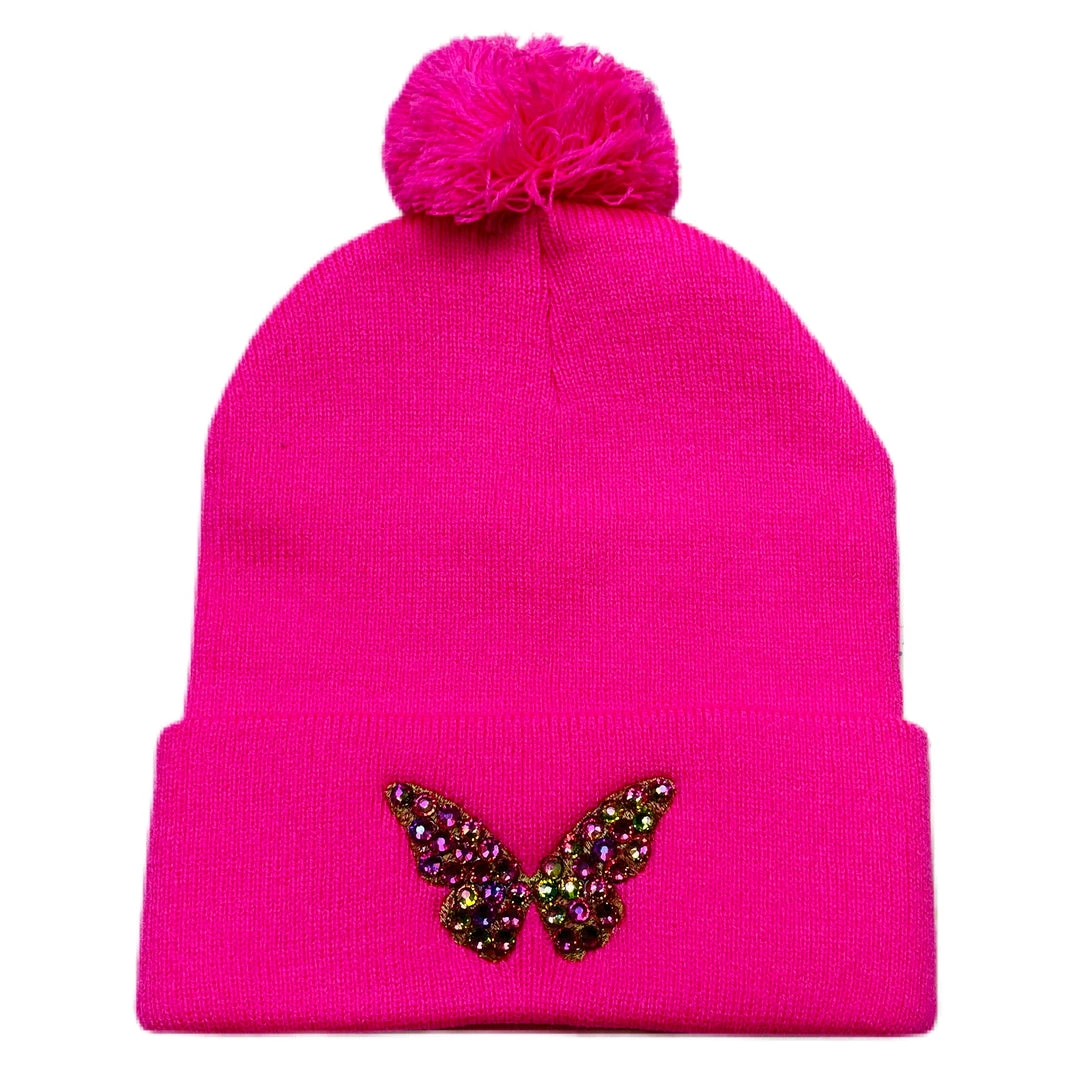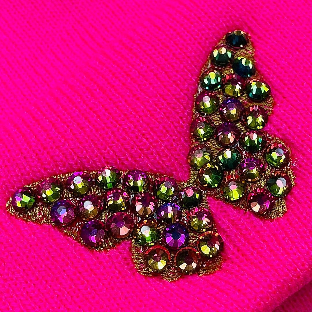 This beanie is embroidered with the outlined butterfly motif and topped with many “rainbow glass” rhinestones that change color as you move the stones from side to side.
