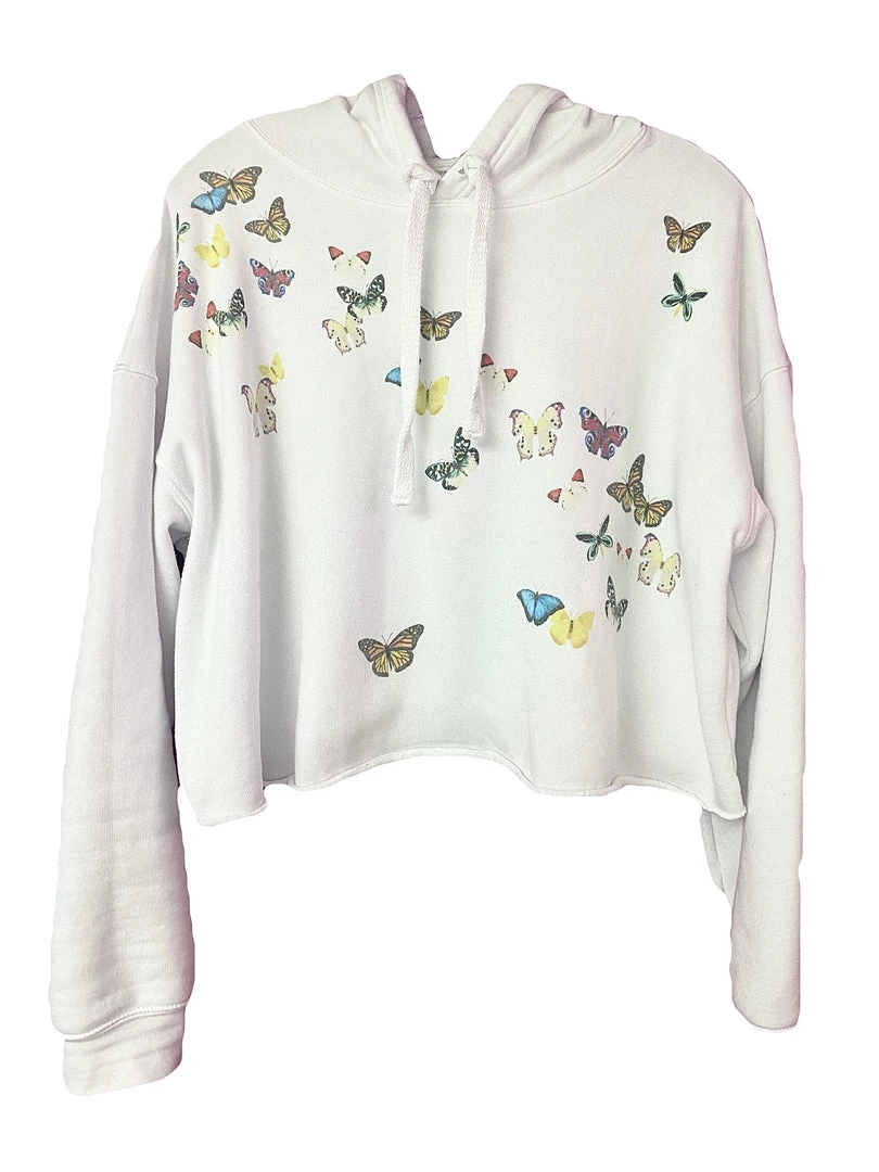This is a super soft, cropped hoodie in bright white with butterflies dyed through sublimation across the front. Style is meant to be slightly oversized. All sublimation is done in house by the Brittany Allen team.