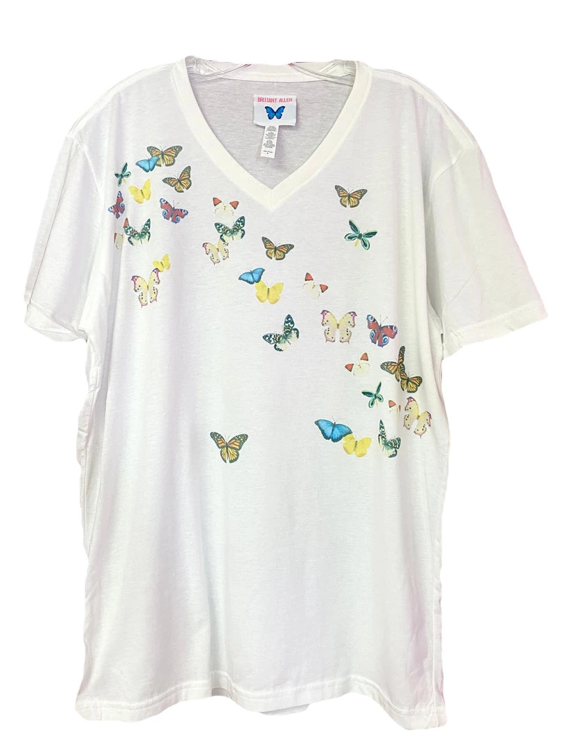 This is a soft, v-neck tee in bright white with butterflies dyed through sublimation across the front. Style is true to size. All sublimation is done in house by the Brittany Allen team.