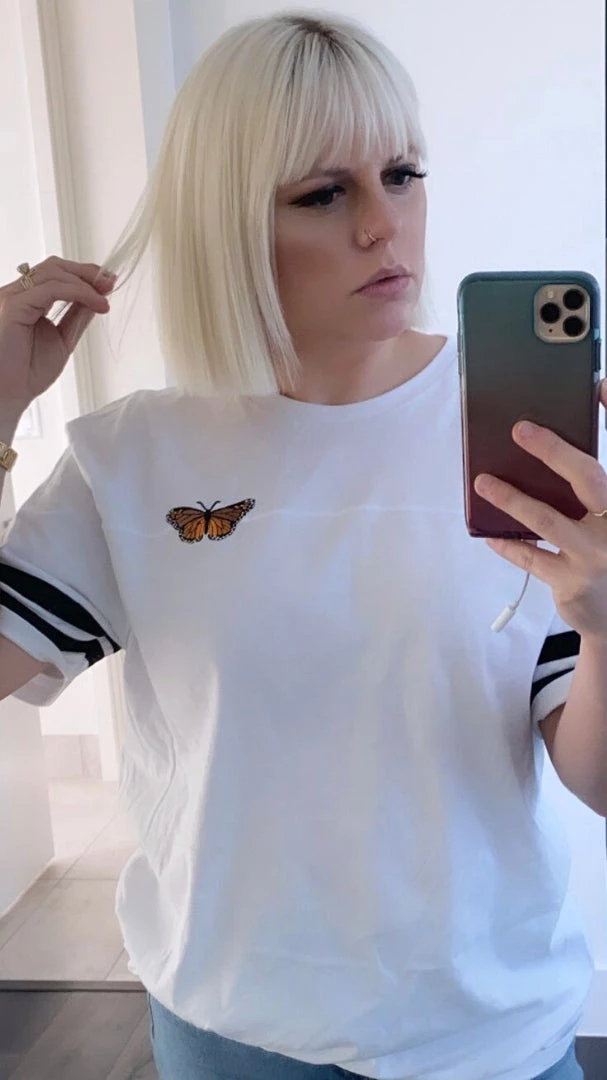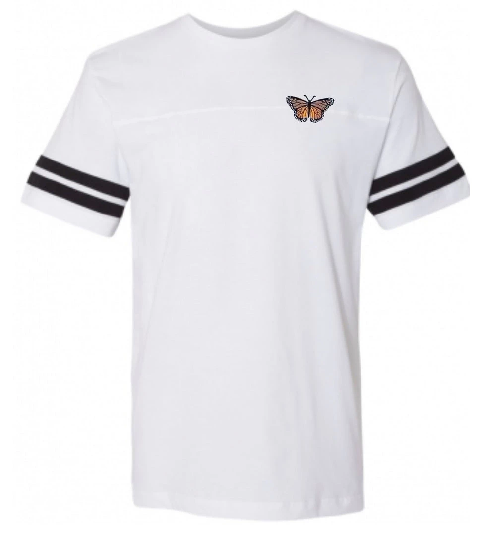 The Monarch Football Tee is a white, front-yoke tee with black stripes on the sleeves and an embroidered monarch on the front yoke seam line.