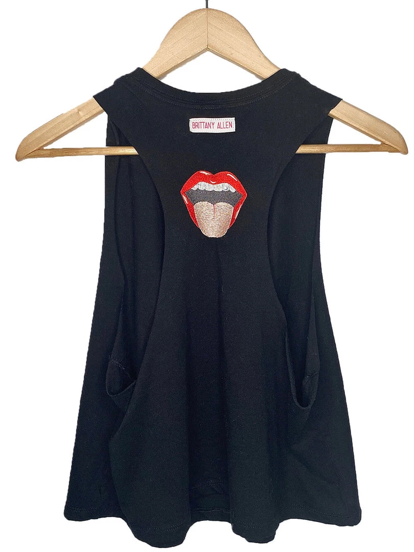 Our “Tongue’s Out” Cropped Tank is embellished with an embroidered mouth and tongue and finished off with a tooth jewel. This tank is a cropped style fit with low, raw armholes, and raw hem. Fit is meant to be slightly big. All embroidery is done in house by the Brittany Allen team.
